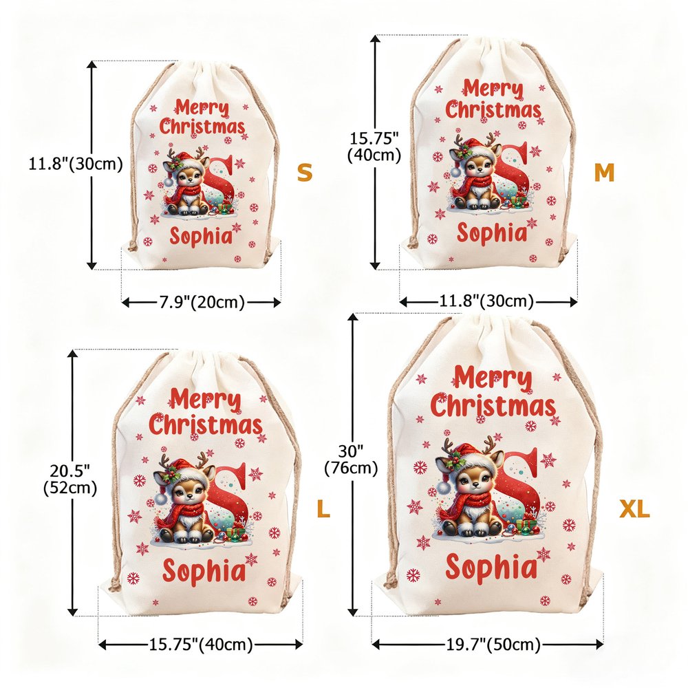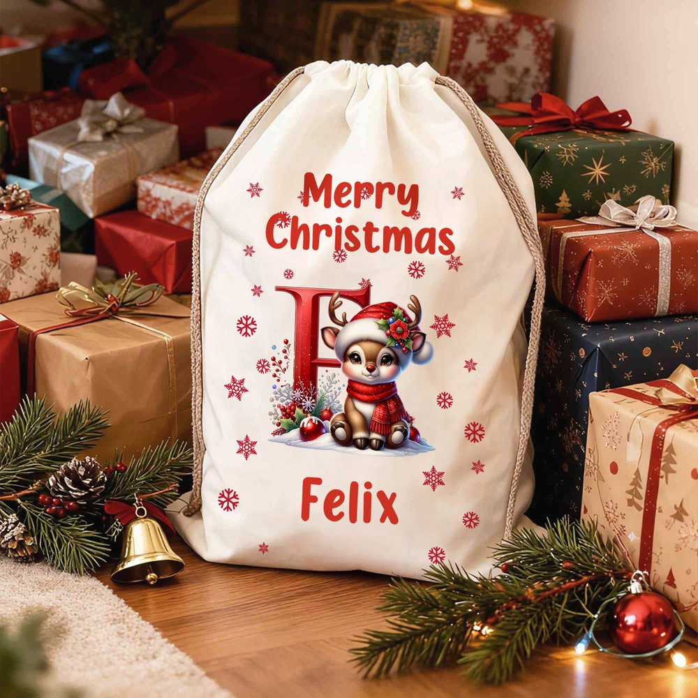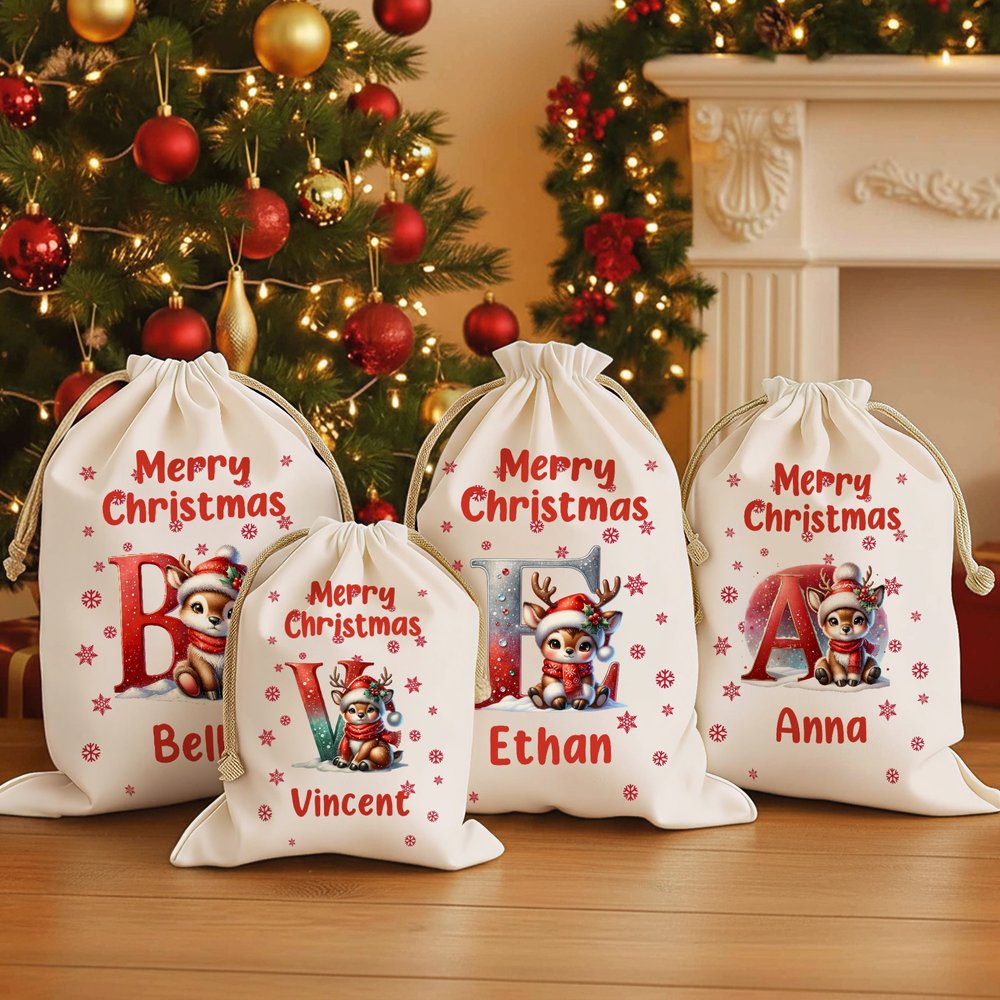 Diese Geschenktüte mit Kordelzug zeigt in der Mitte niedliche Weihnachtsinitialen und Rentiere vor einem Hintergrund aus verstreuten Schneeflocken und versprüht kindliche Unschuld und eine warme, festliche Atmosphäre. Gestalten Sie die Tasche mit Ihren Initialen und Ihrem Namen und verwandeln Sie eine gewöhnliche Geschenkverpackung in ein einzigartiges weihnachtliches Andenken, das ein Gefühl der Fürsorglichkeit und Überraschung vermittelt.