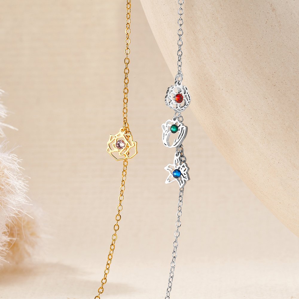 Jedes Armband hat wunderschön detaillierte Geburtsblumen, die den Geburtsmonat des Empfängers darstellt. Gepaart mit einem passenden Geburtsstein entsteht ein einzigartiges Accessoire, das Identität und Verbundenheit ausdrückt.