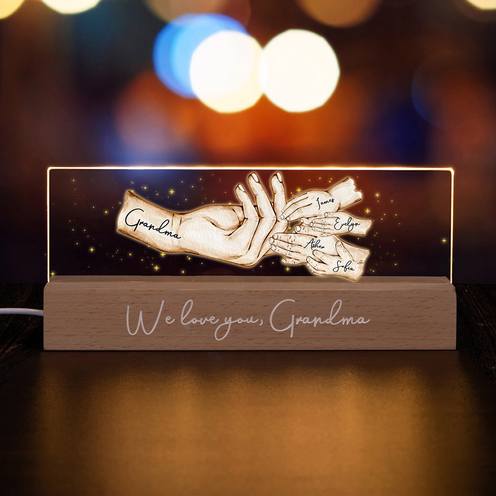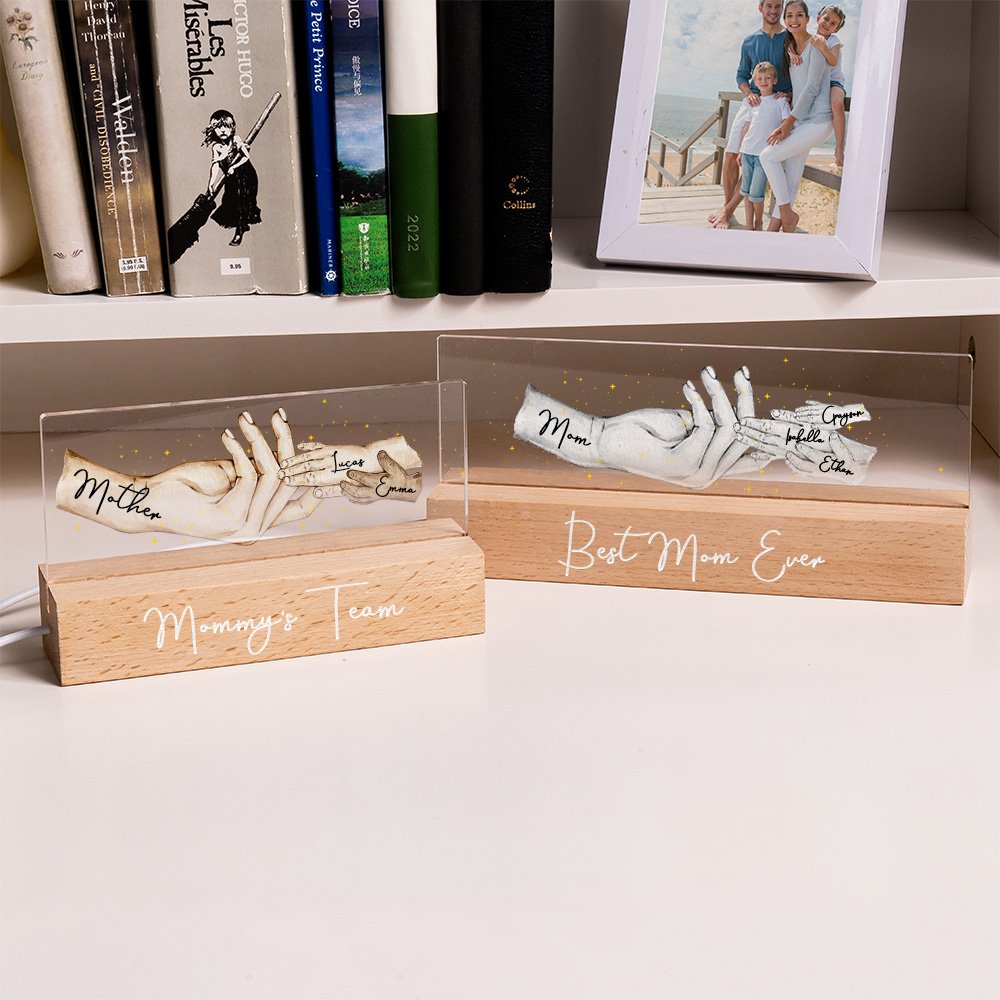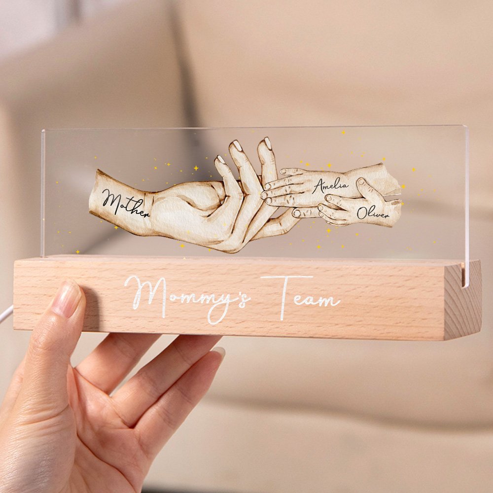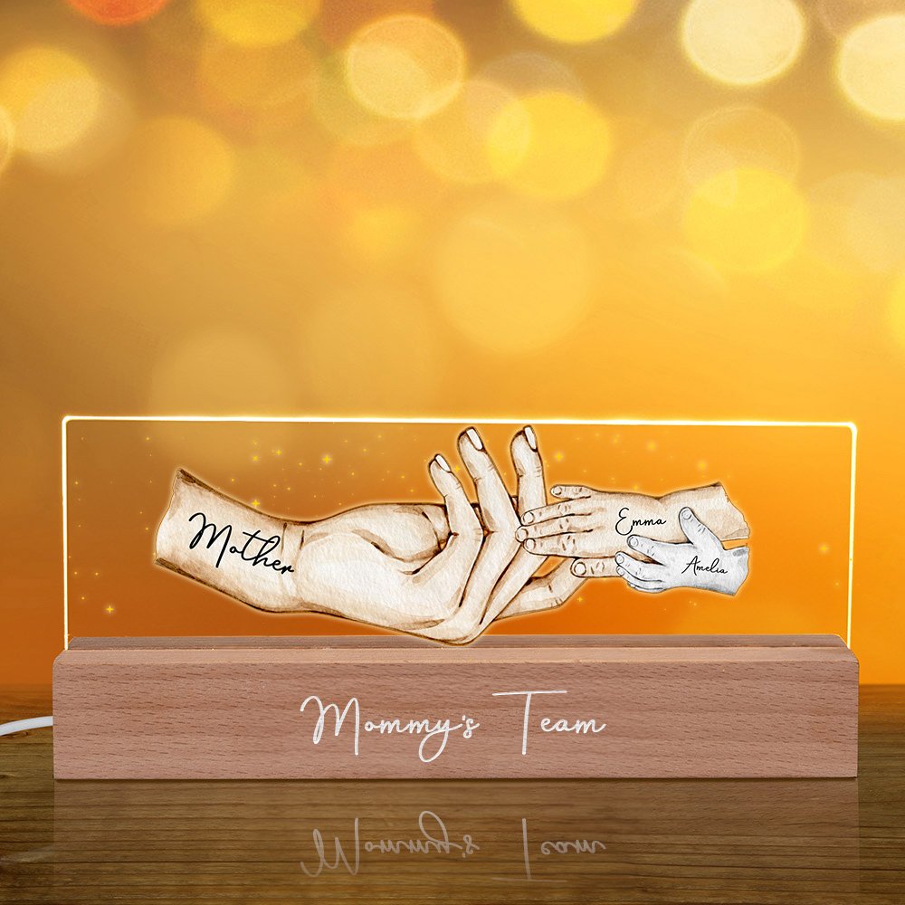 Dieses niedliche und skurrile "Faustschlag"-Nachtlicht zeigt eine Mutter und "ihr Team" und symbolisiert die tiefe Bindung und das stillschweigende Verständnis zwischen Mutter und Kind. Die Oberfläche der Lampe kann mit dem Namen der Mutter und den Namen von 1-4 Kindern individuell gestaltet werden, und der Holzsockel kann mit einem Schriftzug versehen werden, was diese Lampe zu einem besonderen Andenken macht. Jedes Mal, wenn sie angezündet wird, scheint sie die Wärme und Liebe der Familie zu vermitteln.