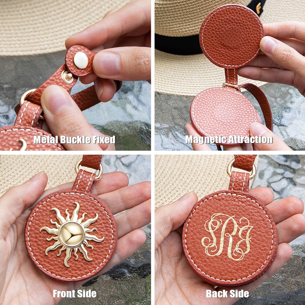 Die Sonne Element ist für den Hut Clip ausgewählt, um Sie zu begleiten, um den sonnigen Urlaub zu genießen. Das Produkt ist aus Leder und Metall gefertigt und kann auch als Rucksackdekoration verwendet werden. Die andere Seite des Hutclips kann mit einem exklusiven Monogramm, das voller Persönlichkeit ist, angepasst werden.