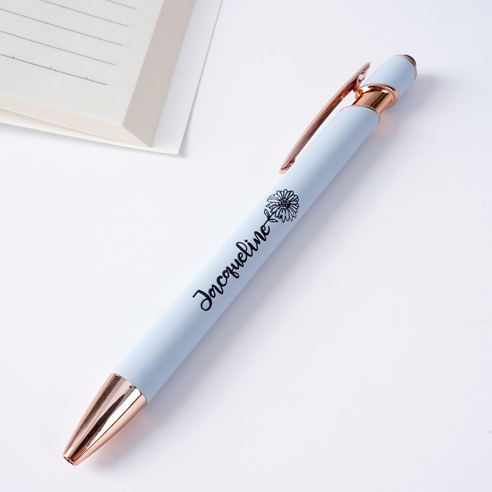 Jeder Kugelschreiber besticht durch ein hochwertiges Farbschema, inspiriert von den sanften Tönen der Morandi-Palette. Sechs sorgfältig ausgewählte Farben stehen zur Wahl und schaffen ein warmes, harmonisches visuelles Erlebnis. Das einzigartige Geburtsblumenmuster auf dem Stiftkörper zeigt die typischen Blumen jedes Monats und steht für exklusive Segnungen sowie persönlichen Charme. Zusätzlich können Sie den Kugelschreiber mit Ihrem Namen individualisieren – so wird jeder Stift zum Unikat, das Ihre Persönlichkeit und Ihren Stil unterstreicht.