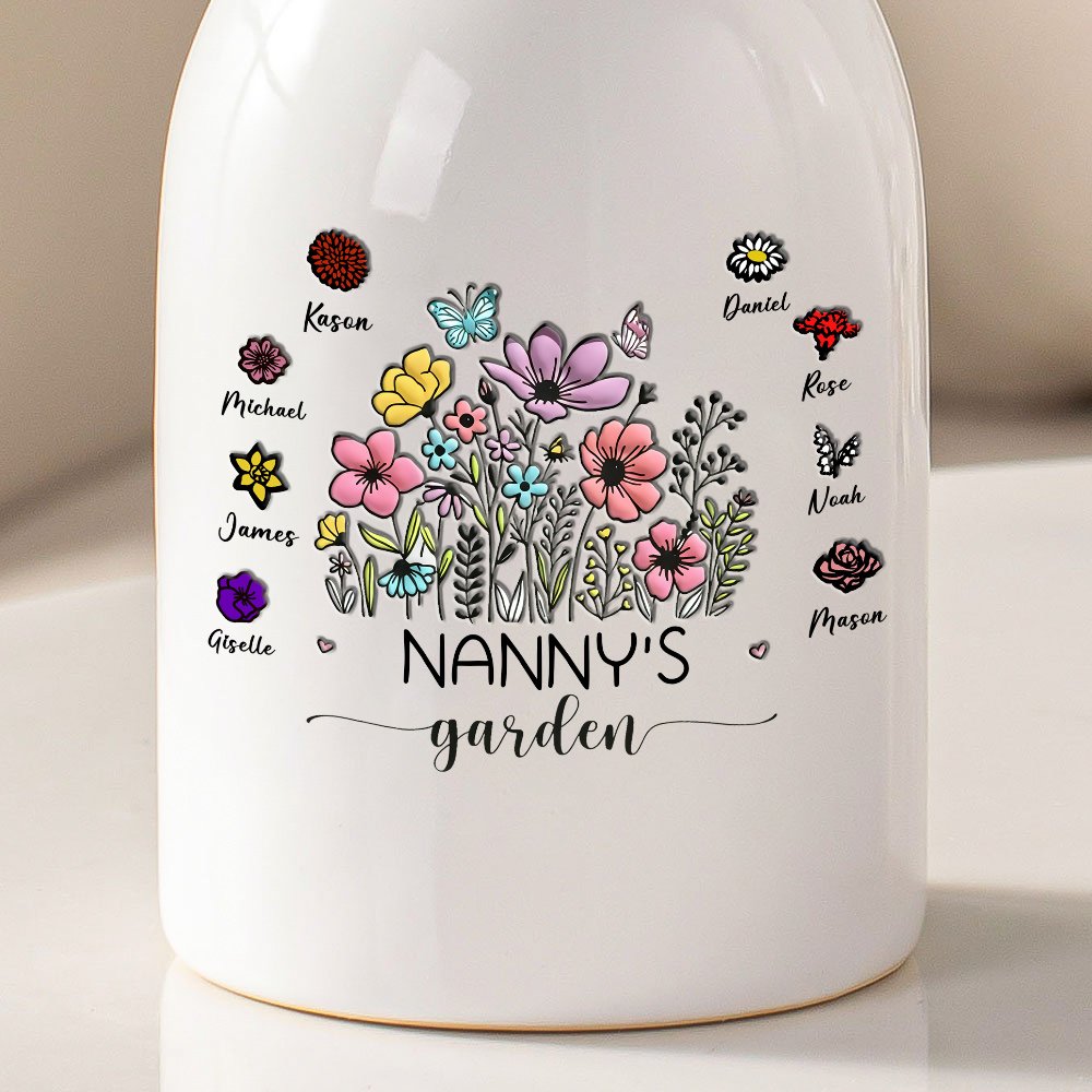 Diese Vase wurde mit Blick auf den Garten Ihrer Großmutter entworfen und kann mit 1-8 Geburtsblumen, die Familienmitglieder repräsentieren, individuell gestaltet werden, um Ihre Persönlichkeit zu zeigen. Sie können auch Ihren Namen zu jeder Geburtsblume anpassen, um diese Vase noch einzigartiger zu machen.
