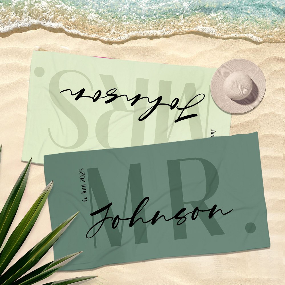 Das Strandtuch-Set zeichnet sich durch ein auffälliges, kontrastreiches Farbschema aus, das stilvoll und auffallend ist. Jedes Strandtuch ist mit den Worten Mr und Mrs sowie dem Nachnamen des Paares bedruckt. Diese Form des individuellen Namenszugs ist sowohl persönlich als auch einprägsam. Die Auswahl an verschiedenen Stilen ist vielfältig und reicht über acht unterschiedliche Varianten, die zueinander passen.