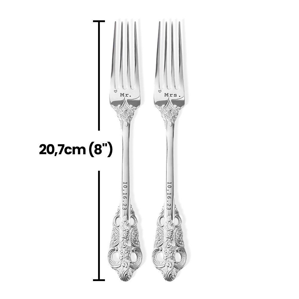 Sie können die Namen oder Titel des Paares auf der Vorderseite der Gabel und das Datum mit besonderer Bedeutung auf dem Griff der Gabel eingravieren lassen, um dieses Paar Gabeln zu etwas ganz Besonderem zu machen. Die Lasergravur sorgt für ein raffiniertes und langlebiges Aussehen und macht die Gabel zu einem wertvollen Erinnerungsstück für viele Jahre.