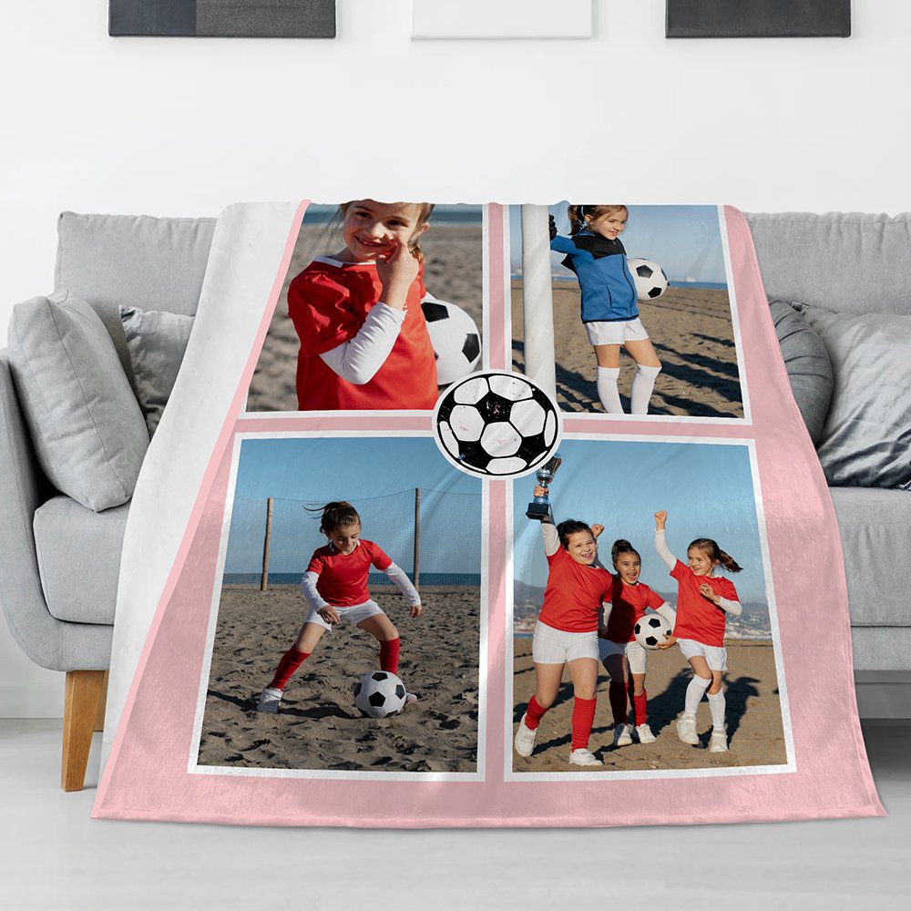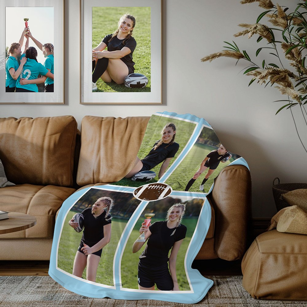 Diese einzigartige Decke kombiniert persönliche Fotos mit ikonischen Sportsymbolen und schafft so ein persönliches Fest der sportlichen Leidenschaft. Das Design ermöglicht die Darstellung von vier Lieblingsbildern neben neun verschiedenen Sportsymbolen: Fußball, Baseball, Basketball, Hockey, Softball, Volleyball, Tennis, Golf oder Fußball. Jedes Sportsymbol ist fachmännisch dargestellt und macht diese Decke zu einer perfekten Darstellung der Lieblingssportarten des Empfängers.