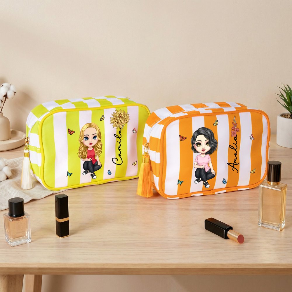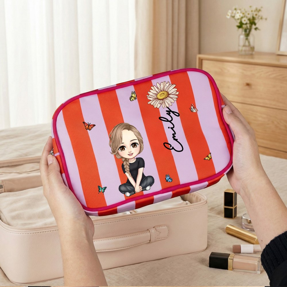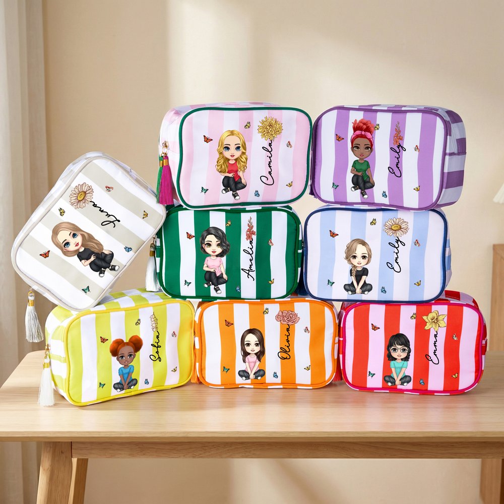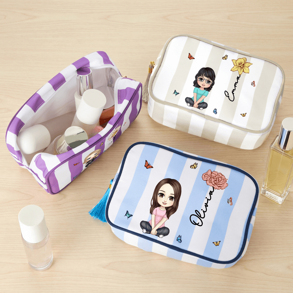 Jede Schminktasche ist mit einem einzigartigen Geburtsblumenelement verziert, das einen anderen Geburtsmonat und die damit verbundenen Eigenschaften symbolisiert. Sie können eine Geburtsblume auswählen, die Ihrem eigenen Geburtstag oder dem eines geliebten Menschen entspricht, und sie mit einer Comicfigur und einem Namen versehen, was jeder Verwendung eine besondere Bedeutung verleiht und jede Schminksitzung zu einer warmen Erinnerung macht.