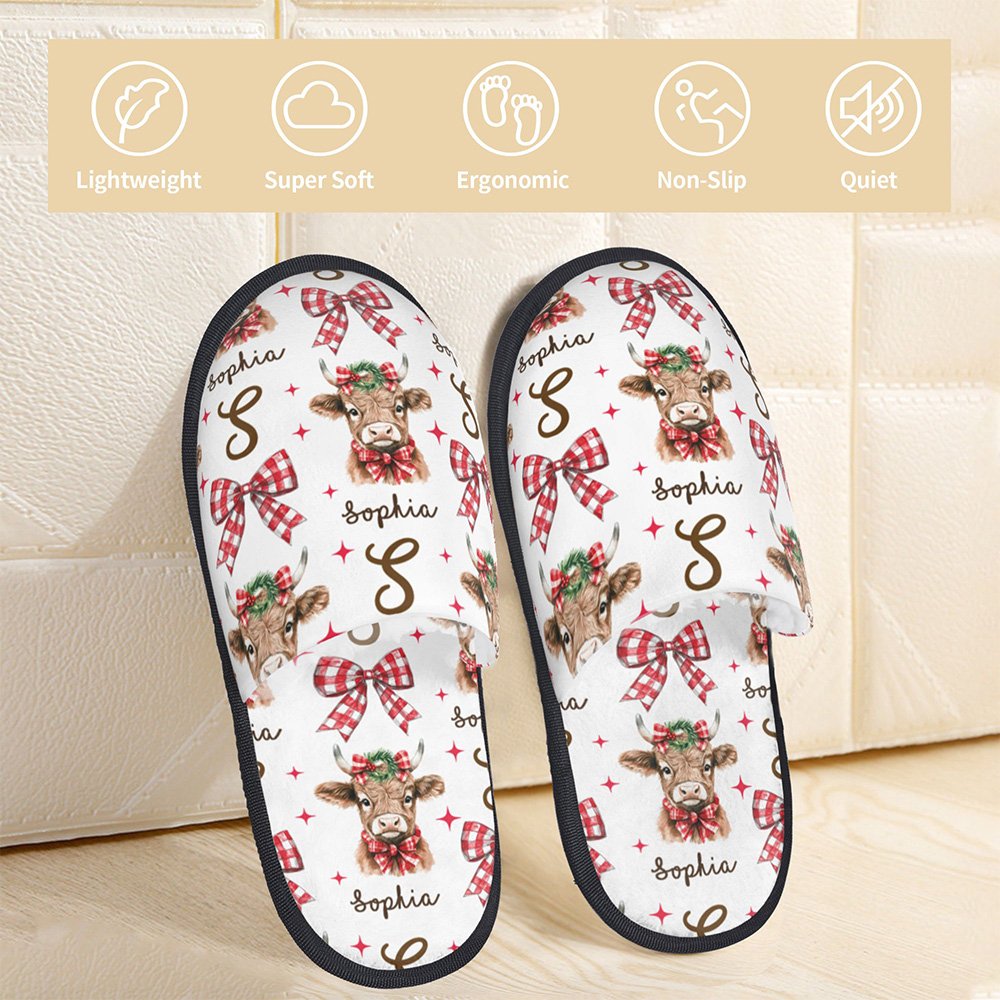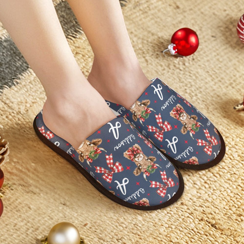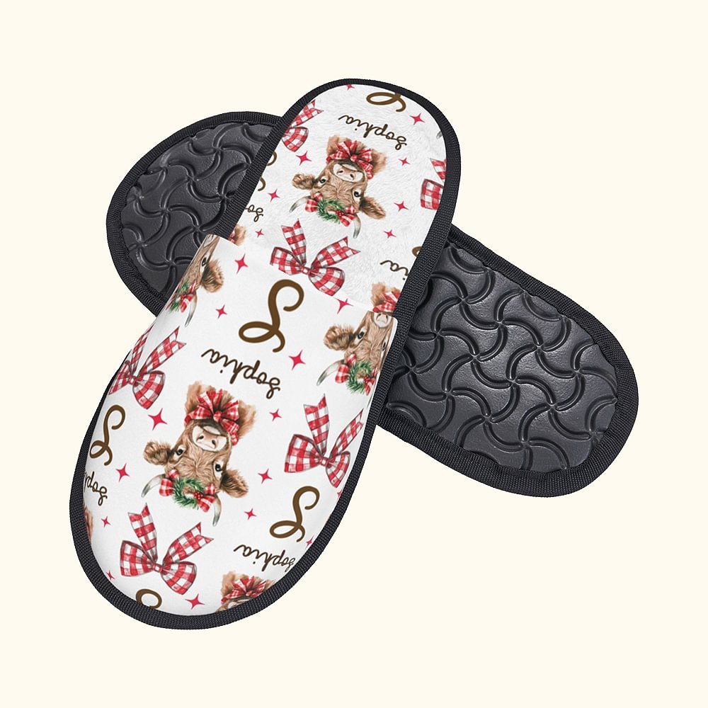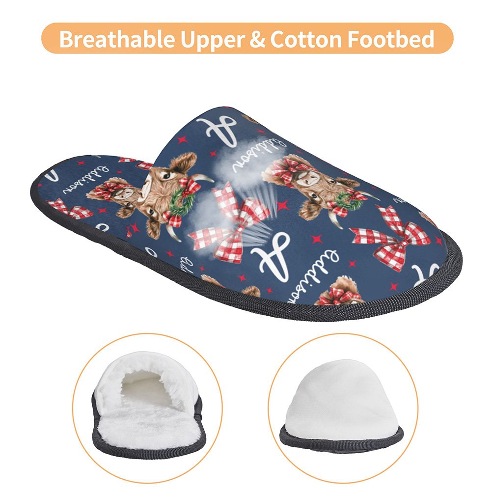 Das Gesamtdesign dieses Hausschuhs ist mit dem schönen Weihnachts-Hochlandkuh-Element thematisiert, das die Schleife und die Hochlandkuh-Girlande geschickt miteinander verbindet und eine starke festliche Atmosphäre vermittelt. Die Hochlandkuh Bild auf den Hausschuhen ist lebensecht und naiv, so dass die Menschen die Freude und Wärme des Urlaubs auf einen Blick fühlen können. Sie können auch Ihren Namen auf den Hausschuhen anbringen, um sie noch unverwechselbarer zu machen.