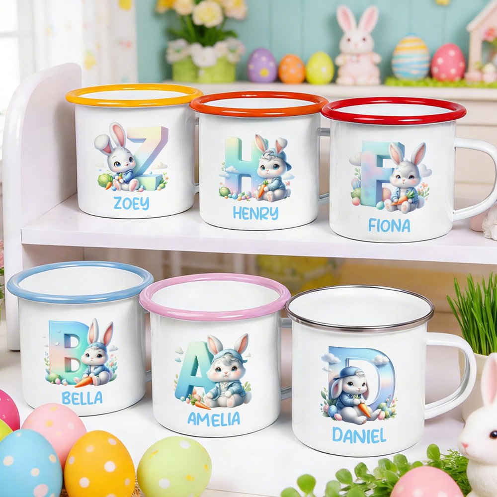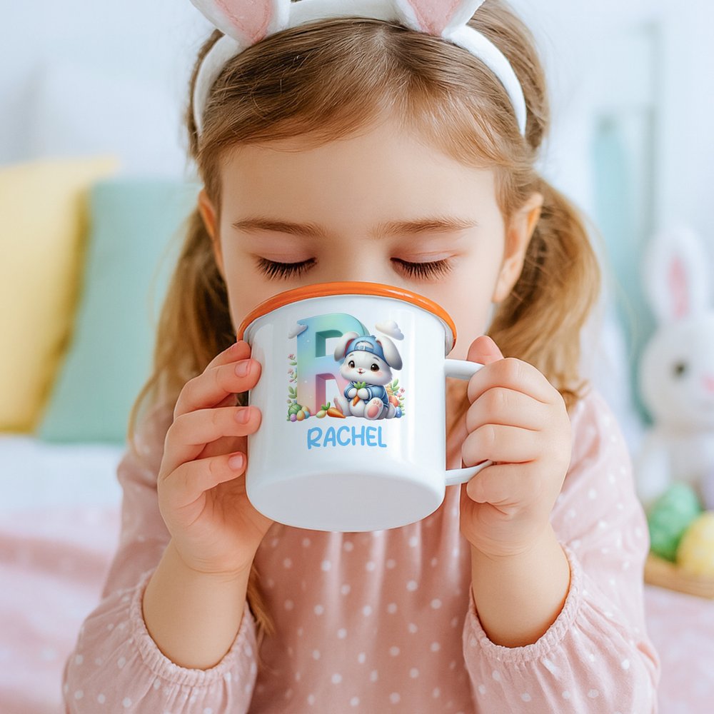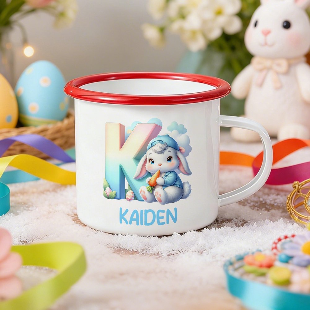 Personalisierte 355 ml Emaille Tasse im niedlichen Kaninchen-Design mit Namen und Initiale Ostern Geschenk für Jungen Mädchen