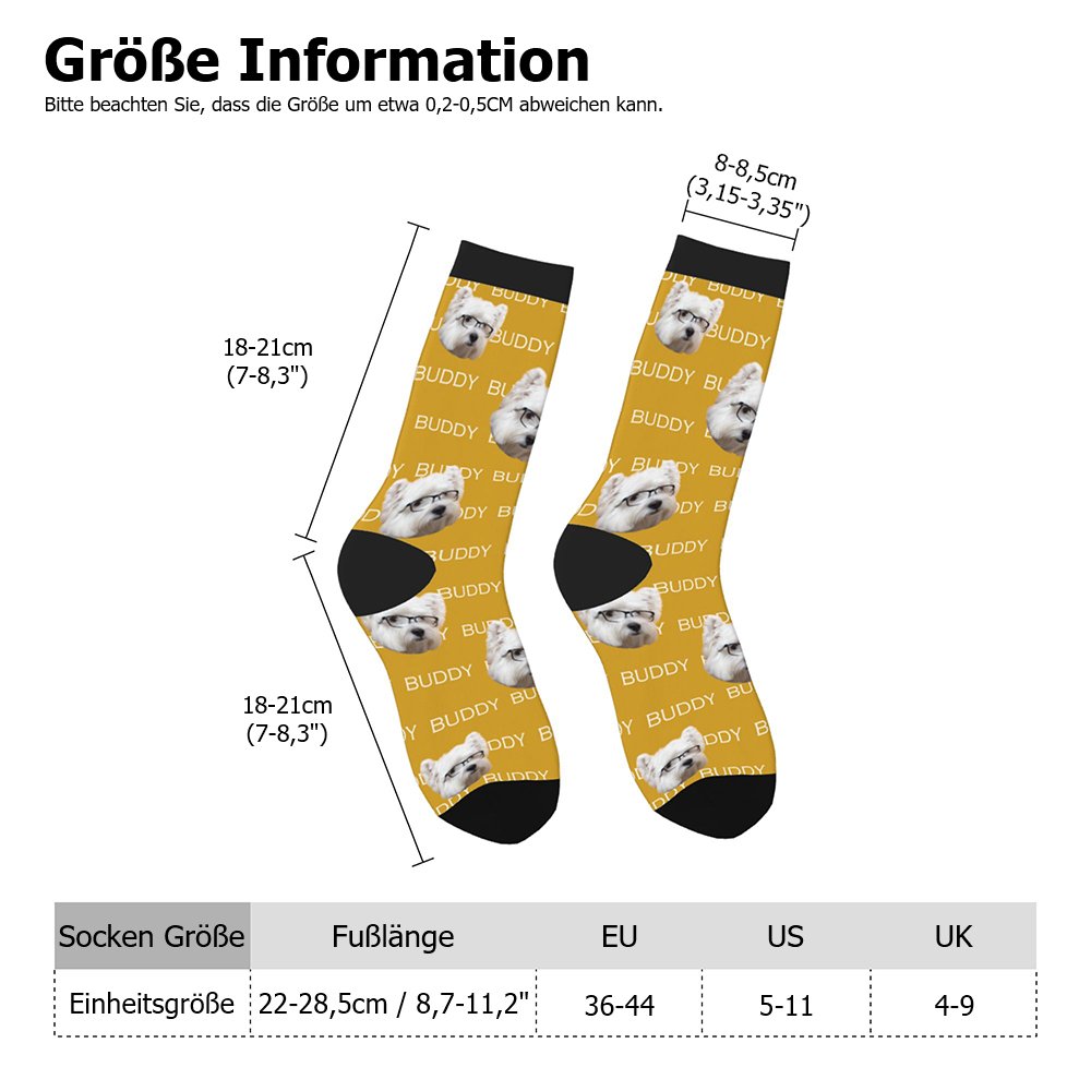 Mit ihren lebhaften, farbenfrohen Designs, die mit dem Abbild und dem Namen Ihres Haustieres individuell gestaltet werden können, bieten diese Socken eine lustige und persönliche Möglichkeit, Ihren pelzigen Begleiter zu feiern.