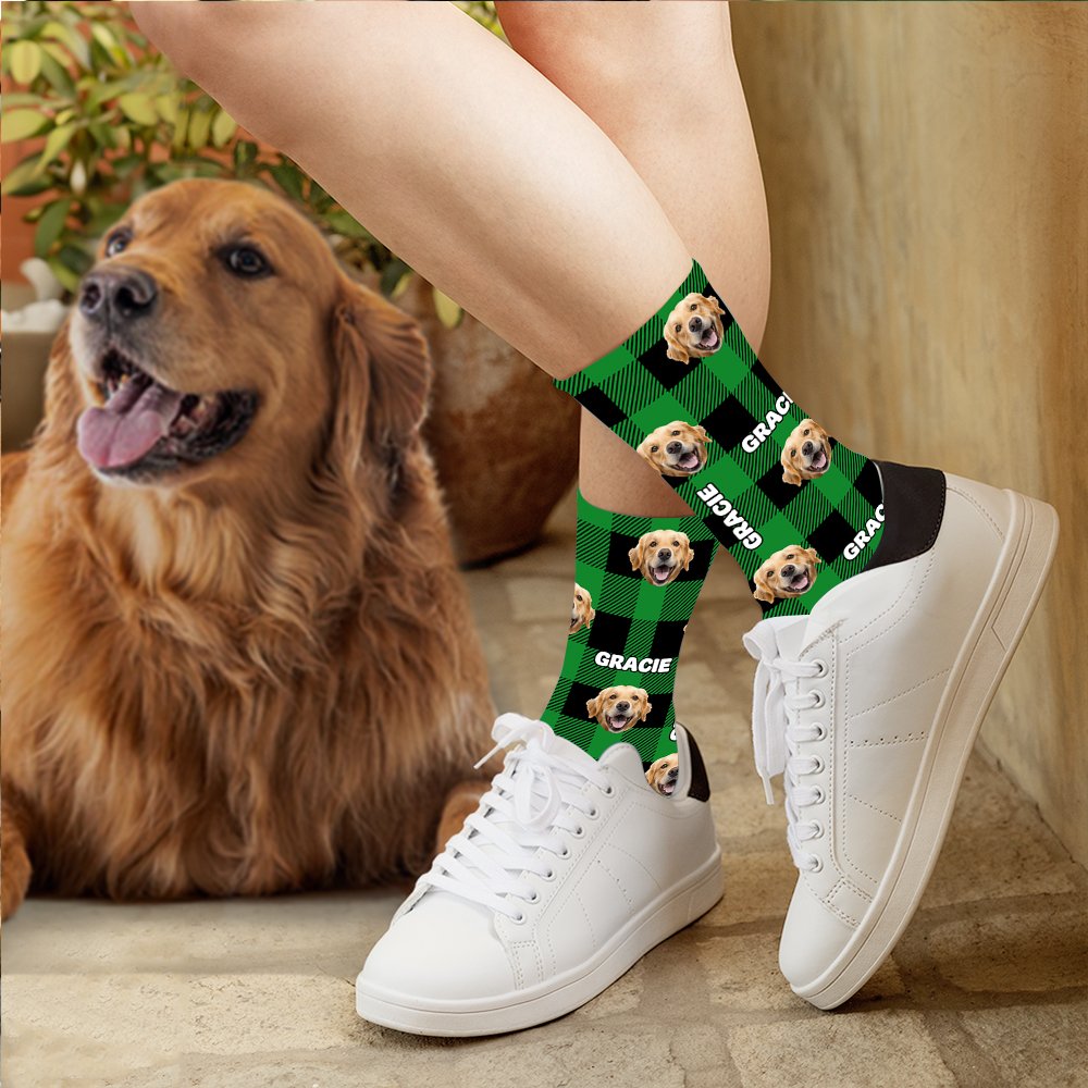 Der Hauptteil dieser Socke ist mit einem bunten Karomuster versehen, das sowohl klassisch als auch modisch ist. Die Socken enthalten auch anpassbare Charaktere oder Fotos von Haustiergesichtern in ihrem Design, was sehr interessant und niedlich ist. Du kannst auch den Namen auf der Socke individuell gestalten, um sie noch unverwechselbarer zu machen.