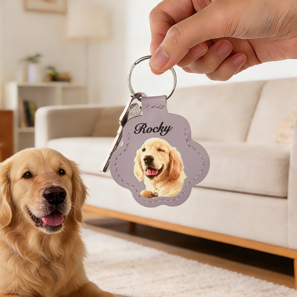 Mit diesem herzlichen Schlüsselanhänger können Sie das Foto Ihres Haustieres auf einem bezaubernden Lederdesign in Form einer Pfote individuell gestalten. Er ist in verschiedenen Farben erhältlich und kann auch mit dem Namen Ihres Haustieres personalisiert werden, um ein einzigartiges Andenken zu schaffen, das die besondere Beziehung, die Sie teilen, feiert.