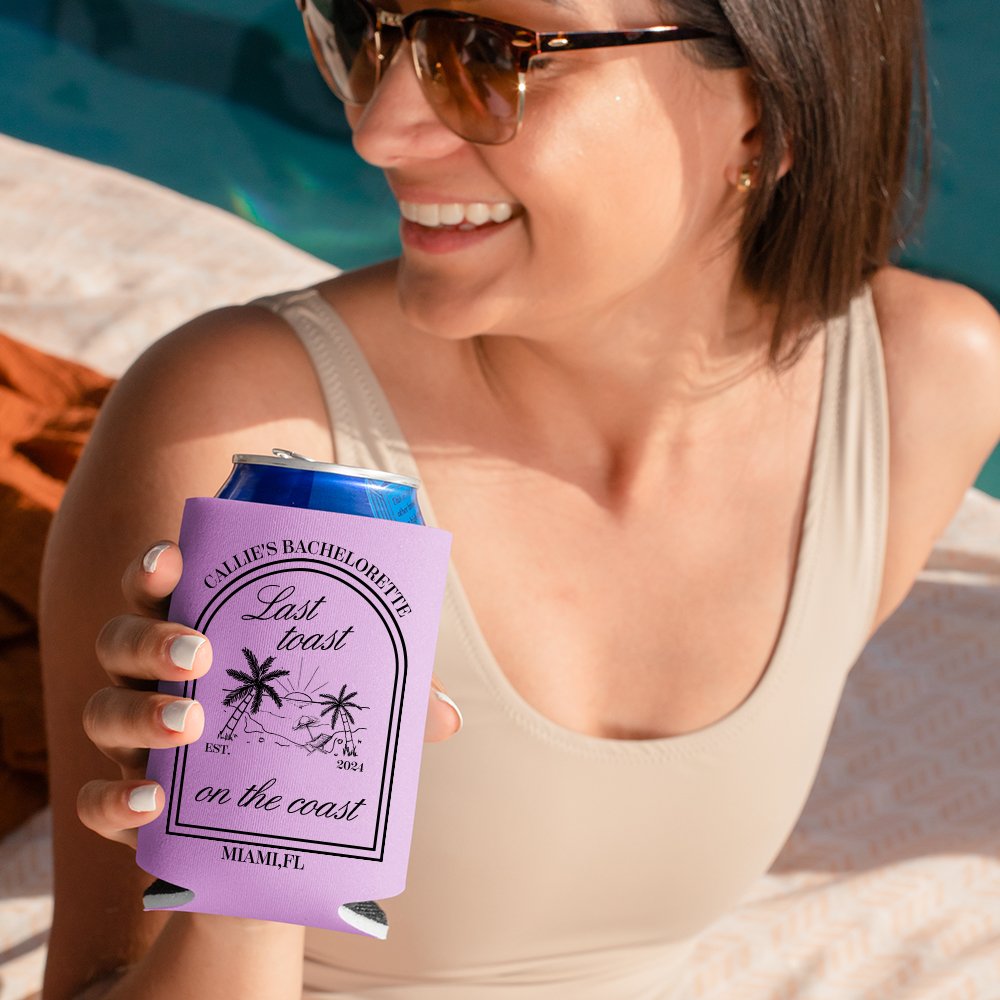 Mit dem einprägsamen Slogan "Last Toast on the Coast" fängt dieser Dosenkühler den Geist von Küstenfeiern auf elegante und lustige Weise ein. Es stehen viele verschiedene Farben und Muster zur Auswahl. Außerdem können Sie Ihren Namen und andere Informationen aufdrucken lassen, um die Dose noch persönlicher zu gestalten. Er ist perfekt für einen Junggesellenabschied am Strand.