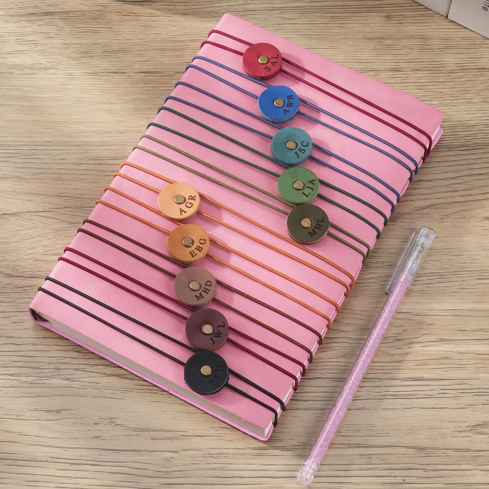 Dieses elastische Nietenband verfügt über ein individuelles Design - eine Lederschnalle mit optionalen eingravierten Initialen, gepaart mit einer strapazierfähigen elastischen Kordel, die in verschiedenen Farben erhältlich ist und zu Ihrem Notebook passt.
