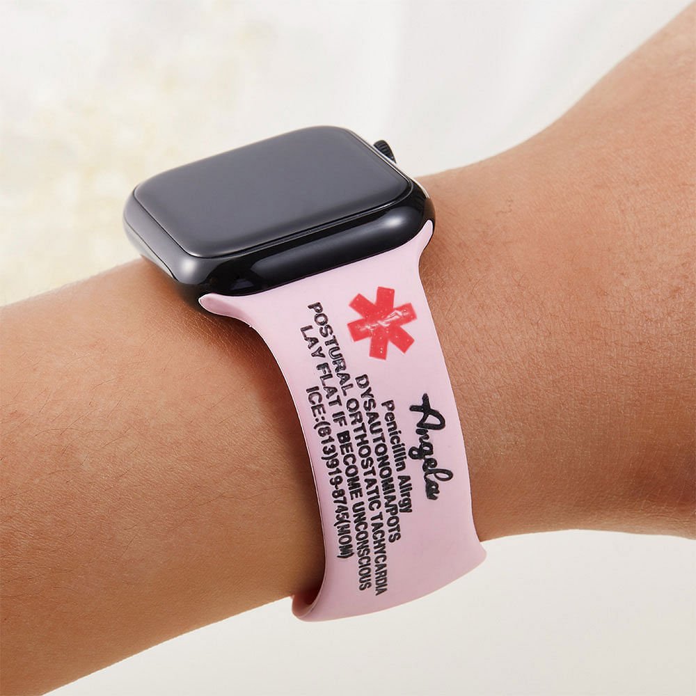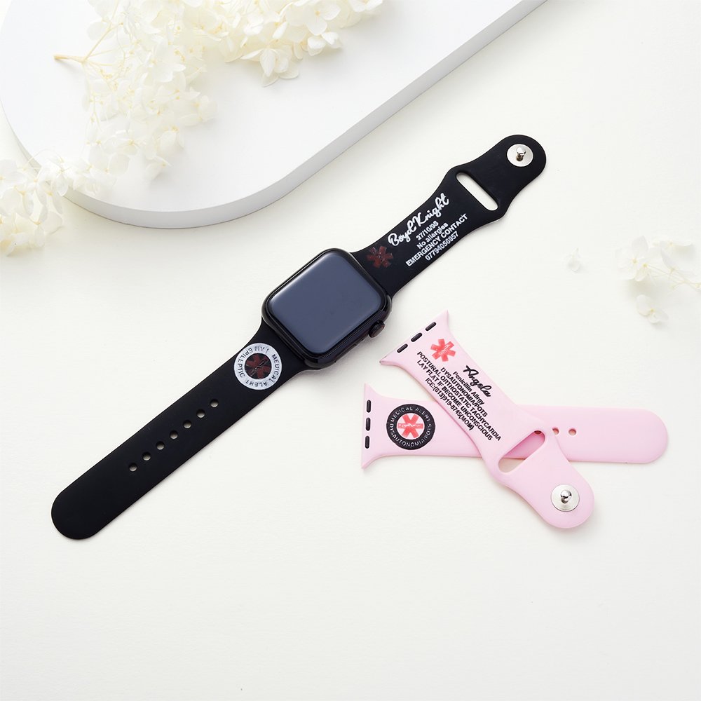 Dieses Band passt an Apple Watches und lässt sich leicht am Armband befestigen, was es zum perfekten Accessoire für Sportbegeisterte macht. Sie müssen bei körperlichen Aktivitäten keinen sperrigen Schmuck mehr tragen und haben dennoch die Gewissheit, dass wichtige medizinische Informationen im Falle unerwarteter Situationen sofort verfügbar sind.