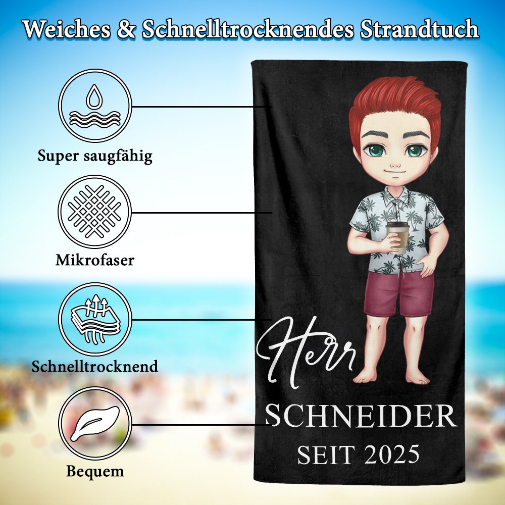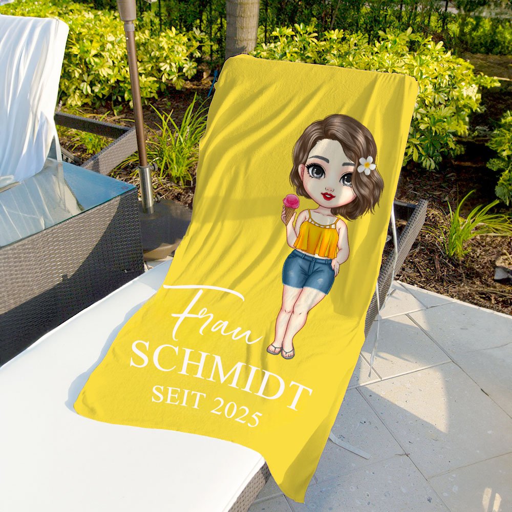 Dieses Strandtuch ist in bis zu 42 Farben erhältlich und zeigt lebendige, witzige Herr- oder Frau-Cartoon-Motive – ein verspielter Ausdruck der Romantik frisch verheirateter Paare. Jedes Tuch kann individuell mit Namen, Titel, Datum usw. personalisiert werden und erhält dadurch einen ganz persönlichen Charakter.