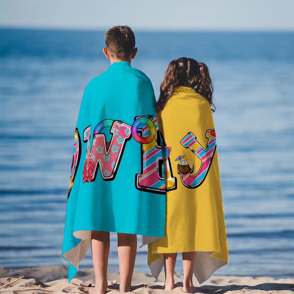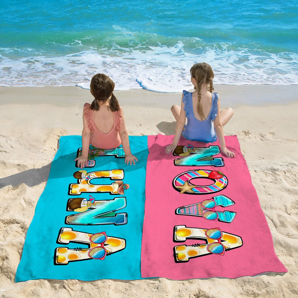 Gestalten Sie dieses farbenfrohe Strandtuch ganz nach Ihren Wünschen mit Ihrem Namen – im fröhlichen Urlaubsstil, der verspielte Motive wie Sonnenbrillen und Schwimmringe kombiniert. Wählen Sie aus neun lebendigen Farben und kreieren Sie ein Strandtuch, das Ihre Persönlichkeit auf besondere Weise widerspiegelt.