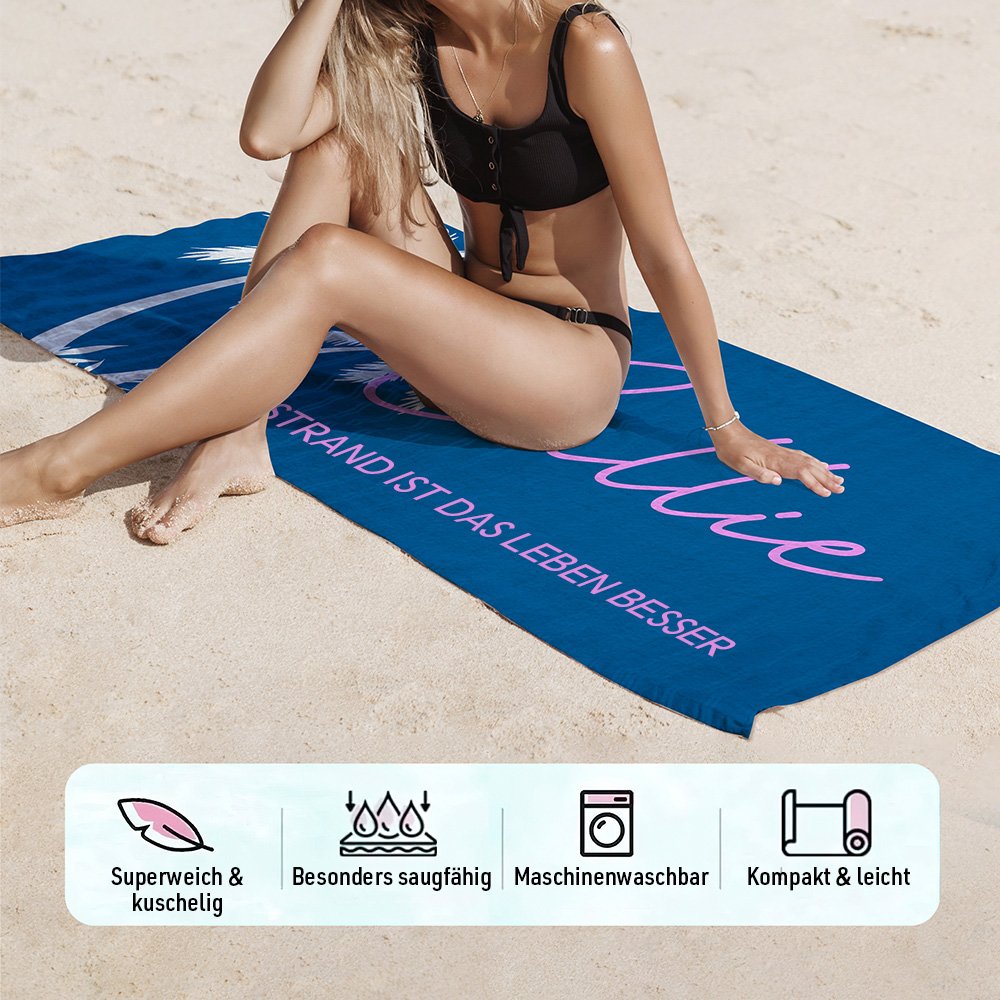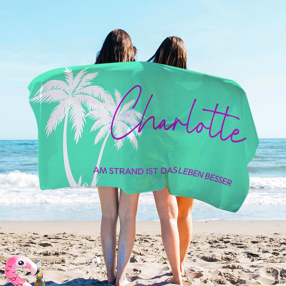 Dieses übergroße Strandtuch verfügt über ein tropisch inspiriertes Design mit anpassbaren Elementen wie 25 leuchtenden Farben für die Palme, das Strandtuch und den Text. Personalisieren Sie es mit einem Namen und einer besonderen Nachricht, um ein einzigartiges Geschenk zu kreieren, das sich von anderen abhebt. Perfekt, um Strandtagen oder Sommerurlauben eine persönliche Note zu verleihen.