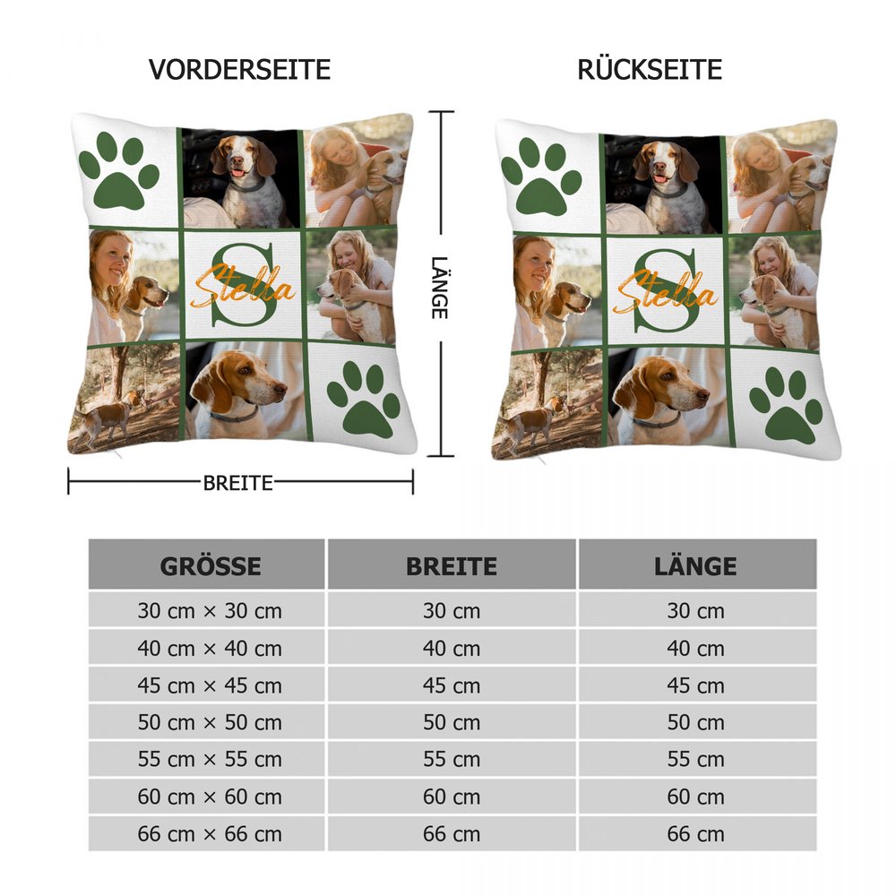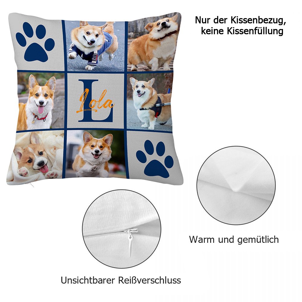 Unsere Kissenbezüge zeichnen sich durch leuchtende Farben aus, wobei Hintergrund, Muster und Name individuell gestaltet werden können. Kombinieren Sie aus einer Vielzahl von Farbtönen Ihre Lieblingskombination. Zeigen Sie sechs schöne Fotos von sich und Ihrem Haustier, umgeben von entzückenden Pfotenabdrücken, die Wärme und Zuneigung ausstrahlen. Personalisieren Sie es mit dem Namen und den Initialen Ihres Haustieres und machen Sie es so zu einem wirklich einzigartigen Dekorationsstück für Ihr Zuhause.