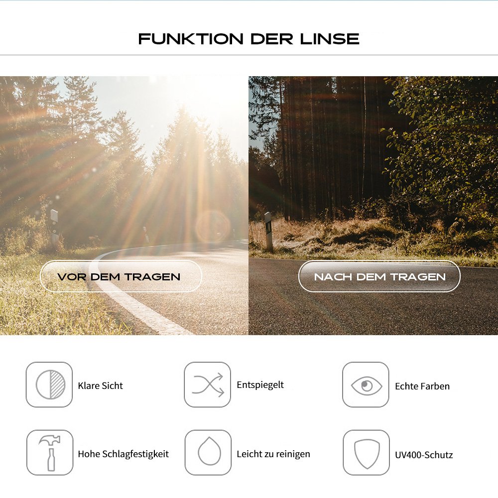 Der aus umweltfreundlichem PC-Kunststoff gefertigte Rahmen ist leicht und strapazierfähig und verfügt über eine außergewöhnliche Kratz- und Stoßfestigkeit. Mit ihren hochwertigen TAC-Gläsern reduziert diese Sonnenbrille effektiv die Blendung durch Straßen, Wasser und Schnee und bietet gleichzeitig zuverlässigen UV-Schutz vor direkter Sonneneinstrahlung bei Outdoor-Aktivitäten.