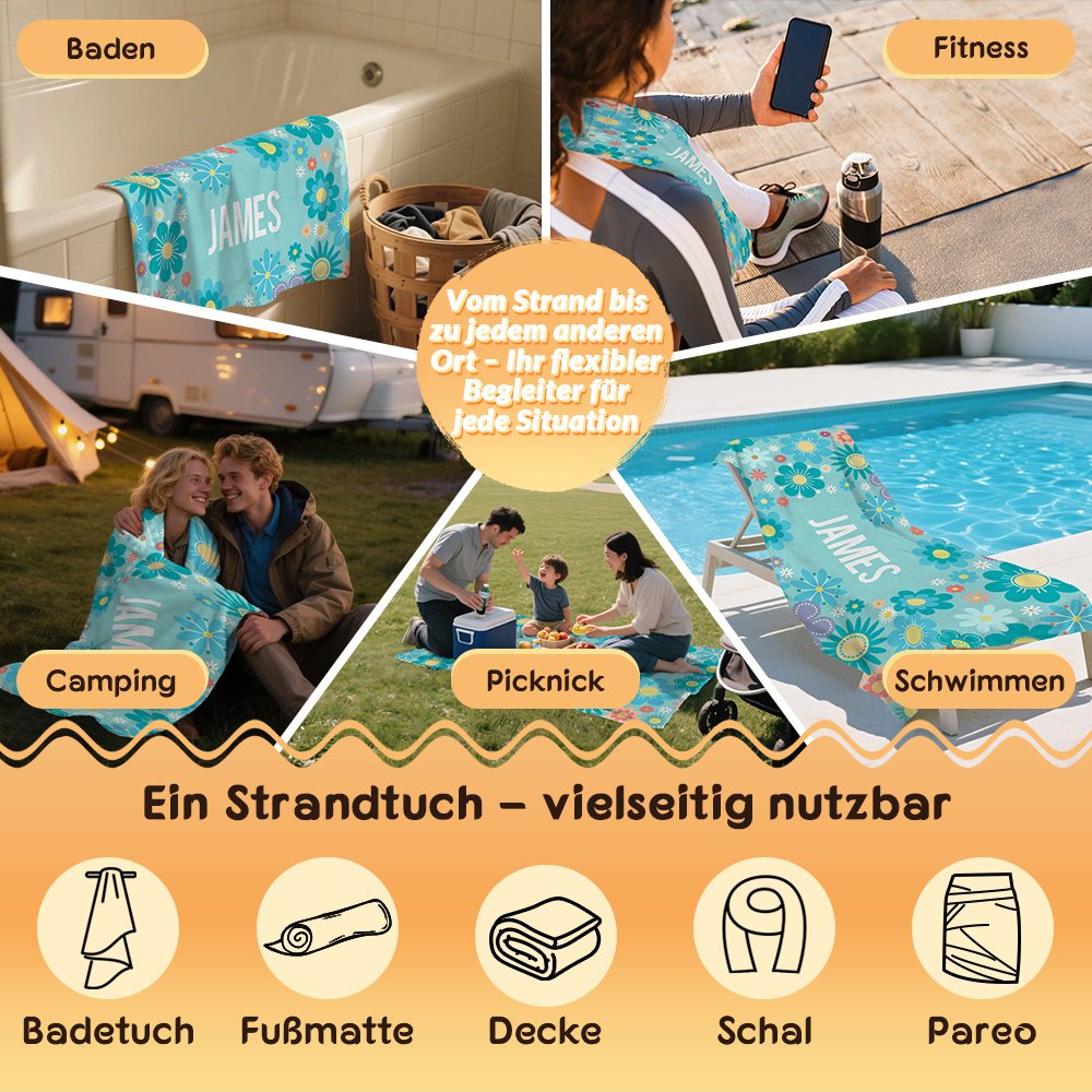 Unser Strandtuch eignet sich nicht nur hervorragend für Strandbesuche oder Poolpartys, sondern ist auch der ideale Begleiter auf Reisen und bei sämtlichen Outdoor-Aktivitäten. Dank seiner kräftigen Farben und dem markanten Blumenmuster fällt es garantiert auf. Es verbindet praktische Funktionalität mit ansprechendem Design und ist ein unverzichtbares Accessoire für gelungene Fotomotive.