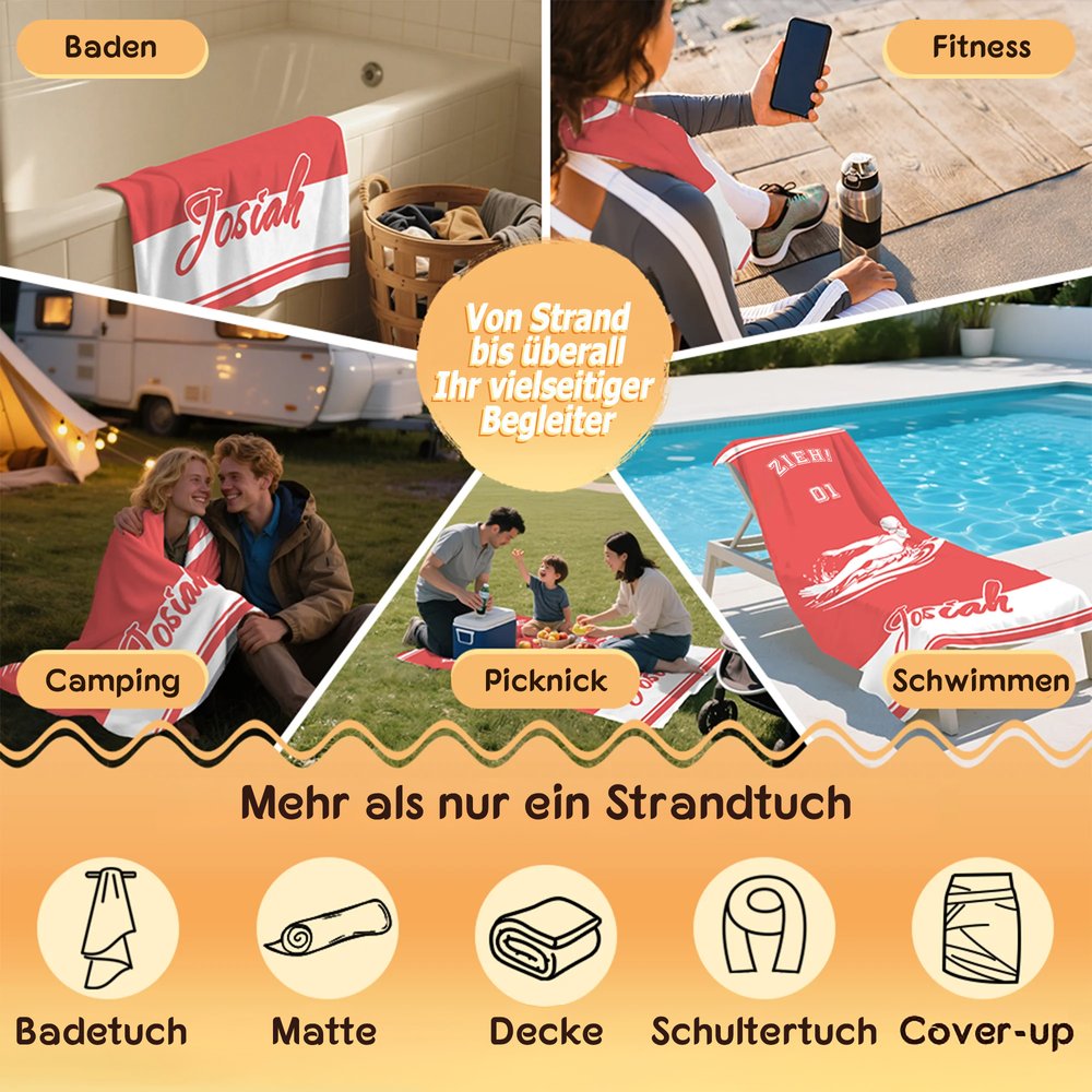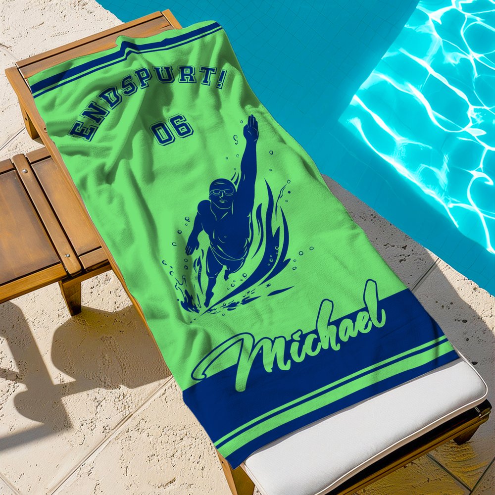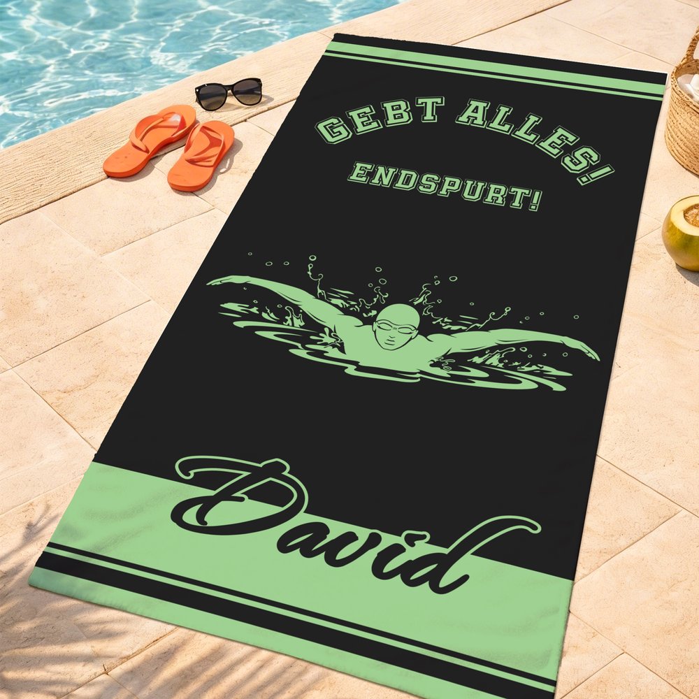 Dieses Strandtuch zeigt eine dynamische Schwimmer-Silhouette, die in verschiedenen Farben erhältlich ist und pure Energie sowie Bewegung vermittelt. Mit dem individuell wählbaren Namen wird es zu einer einzigartigen Ausrüstung, die jeder Schwimmbegeisterte mit Stolz sein Eigen nennen kann. Das klare, minimalistische Design vereint sportliche Funktionalität mit modernem Stil, betont den persönlichen Geschmack und sorgt für einen hohen Wiedererkennungswert.