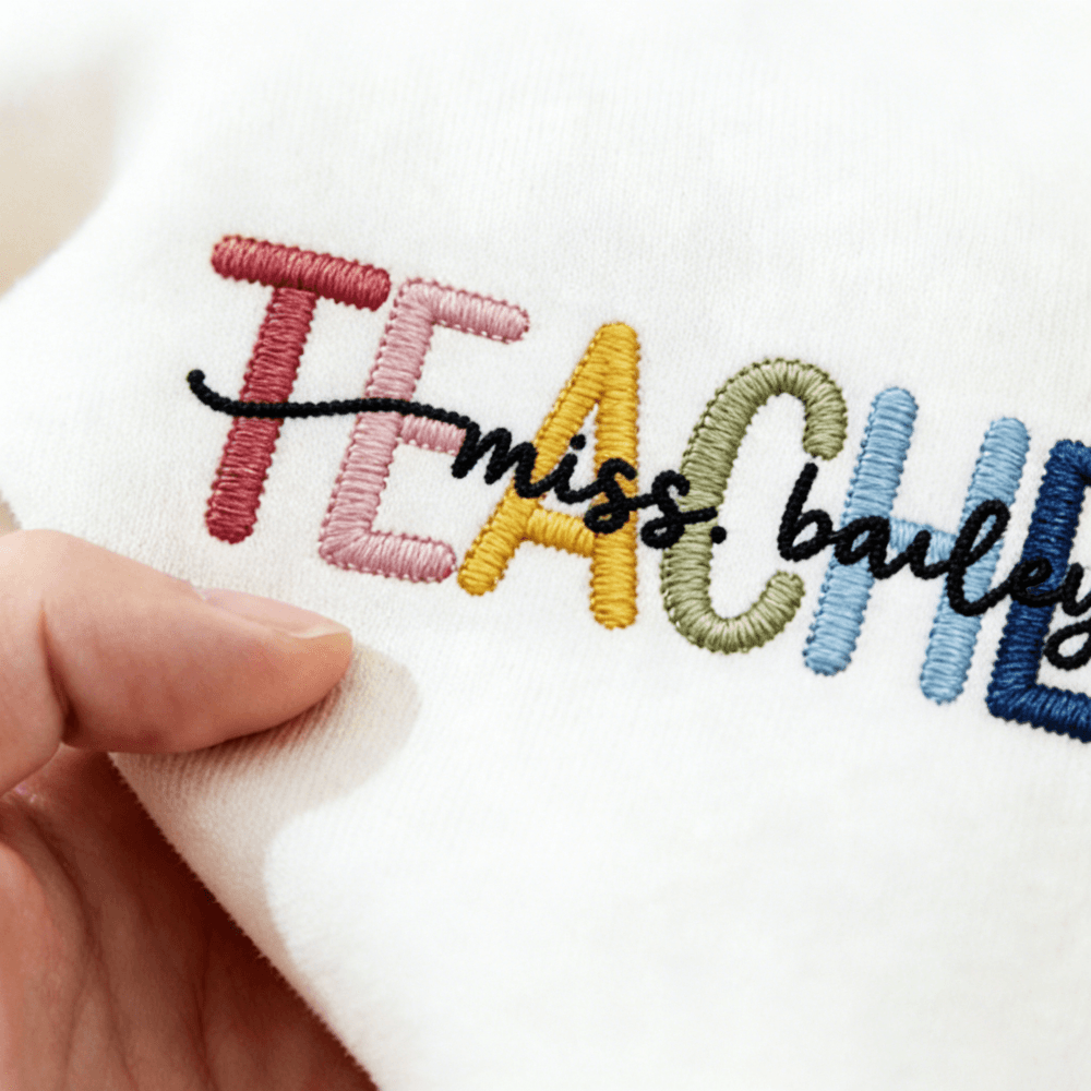 Dieses exklusive Kleidungsstück für Lehrer zeichnet sich durch ein beruhigendes, mehrfarbiges, pastellfarbenes Stickereimuster aus. Das Wort "TEACHER" wird in sanften, leuchtenden Farbtönen zum Leben erweckt, wobei der Name des Lehrers in der Mitte individuell gestaltet werden kann. Die zarte Stickerei verbindet auf perfekte Weise berufliche Identität mit persönlicher Note - einfach und doch mit hohem Wiedererkennungswert. Sie zelebriert den Stolz eines Pädagogen und macht jedes Stück zu einem einmaligen Andenken.