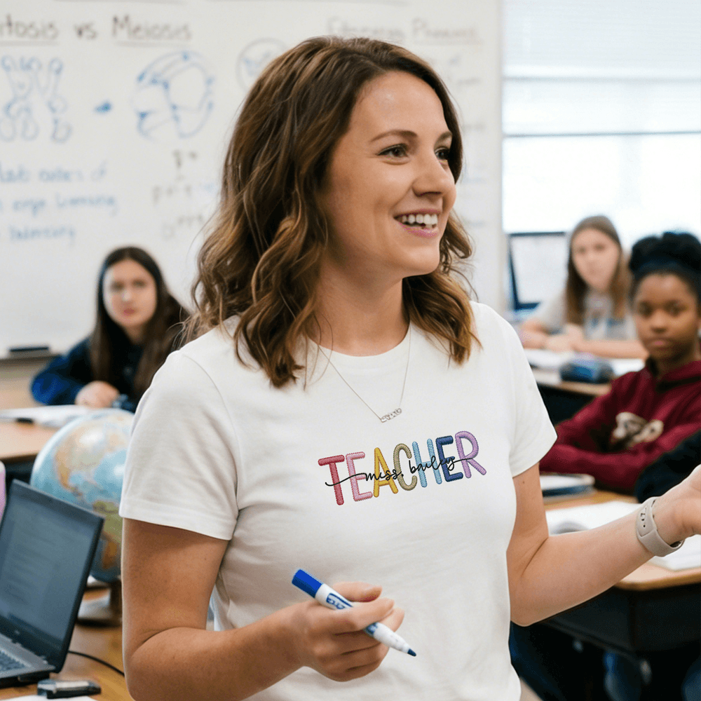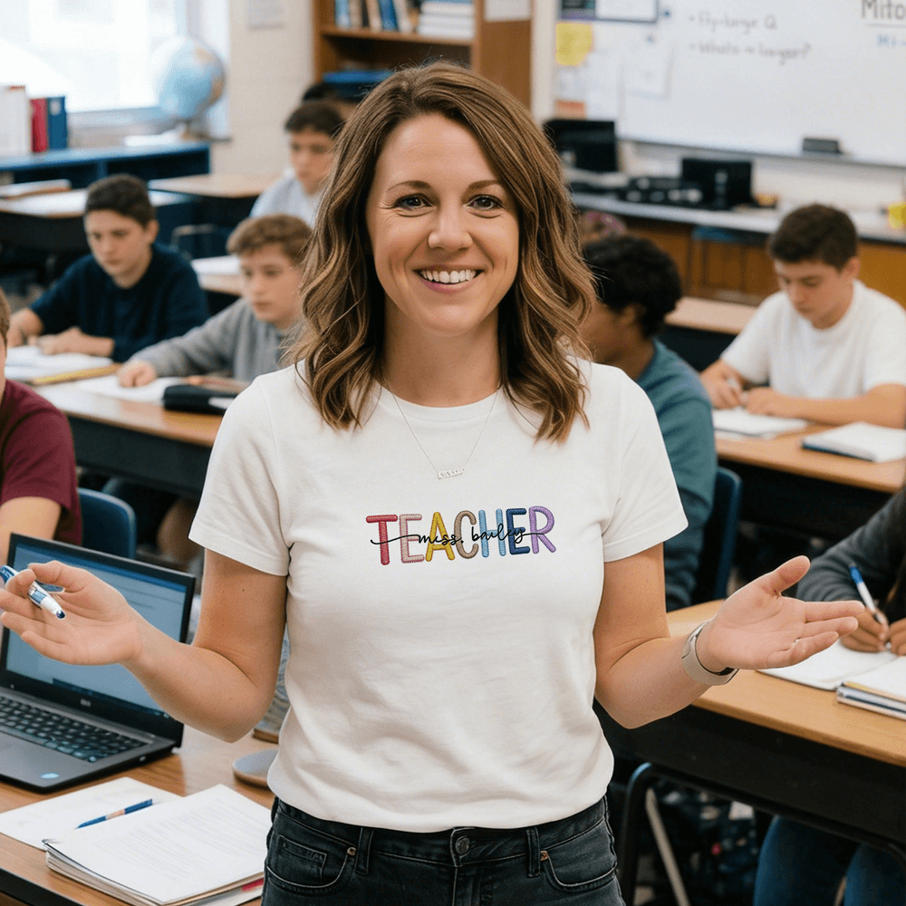 Hergestellt aus hautfreundlichem, atmungsaktivem Stoff - erhältlich in T-Shirt-, Sweatshirt- und Hoodie-Form. Das weiche, dicke Material ist resistent gegen Pilling und Formverlust und garantiert dauerhaften Komfort. Die Stickerei ist robust und fein genäht und übersteht mehrere Waschgänge, ohne auszubleichen oder sich zu lockern. Die lockere Passform eignet sich für alle Körpertypen, bietet Bewegungsfreiheit und ist alltagstauglich - bereit, Lehrerinnen und Lehrer durch den Schulalltag zu begleiten.