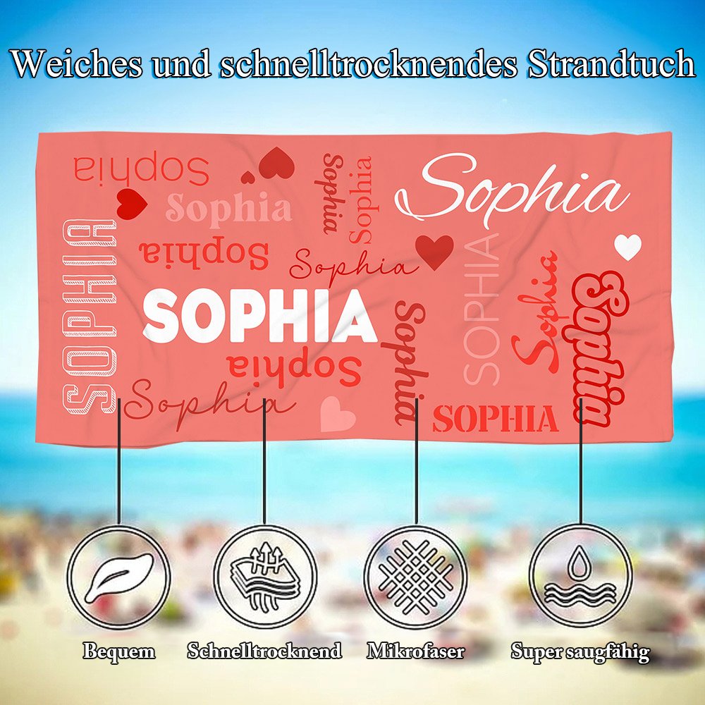 Dieses farbenfrohe Strandtuch ist in 12 Farben erhältlich und verfügt über ein einzigartiges Wortwolkendesign mit Ihrem Namen oder Ihren Sprüchen, damit Sie überall auffallen. Der individuelle Name wird kunstvoll mit verschiedenen Schriftarten dargestellt und spiegelt Ihre Persönlichkeit perfekt wider.