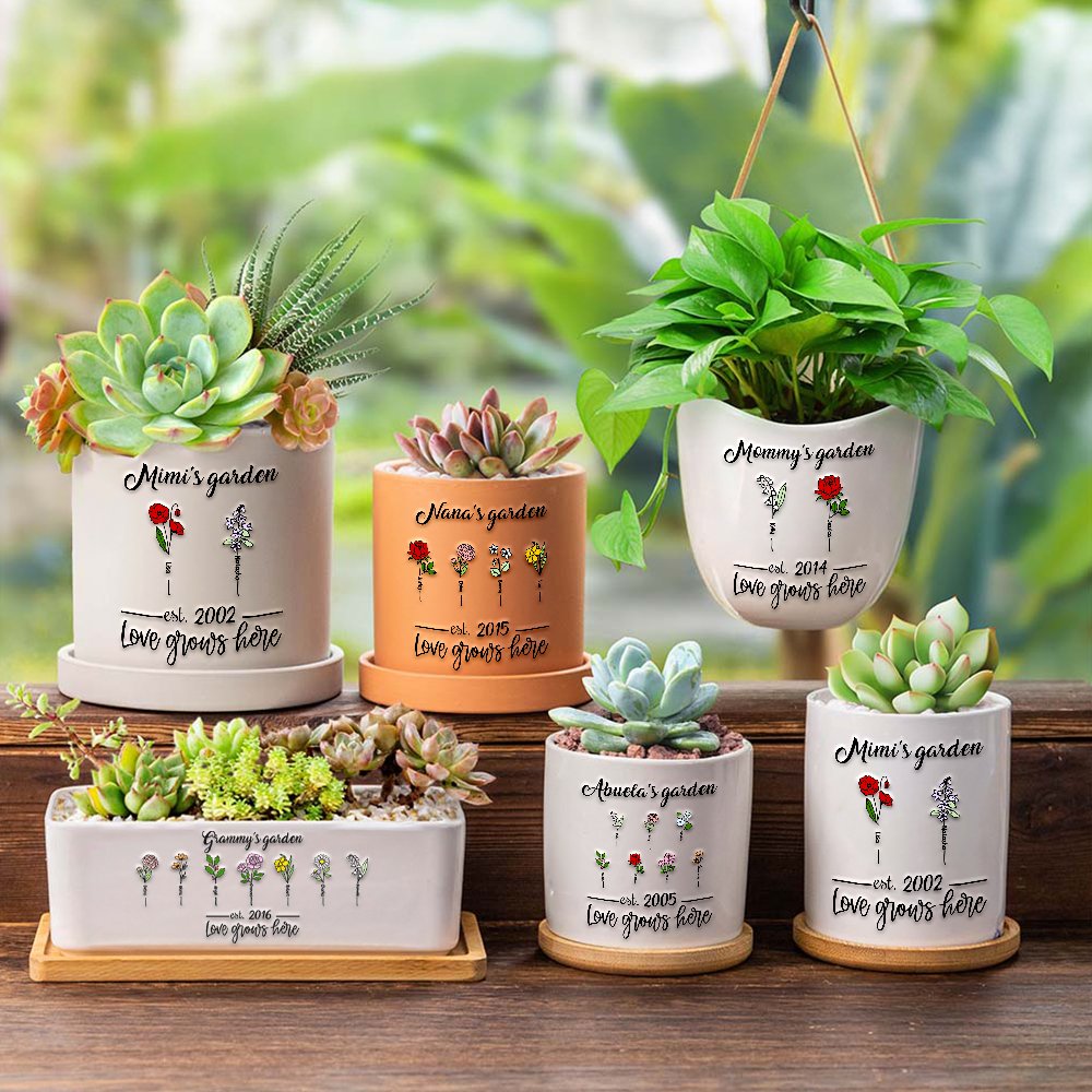 Unser personalisierter Blumentopf ermöglicht es Ihnen, ihn mit 1-12 Geburtsblumen und Namen, die jedes Familienmitglied repräsentieren, individuell zu gestalten. Darüber hinaus gibt es sechs verschiedene Stile, die Ihren ästhetischen Vorlieben entsprechen: Mini Cylinder Style, Regular Style, Mini Terracotta Style, Mini Stone Gray Style, Hanging Style und Rectangular Style.