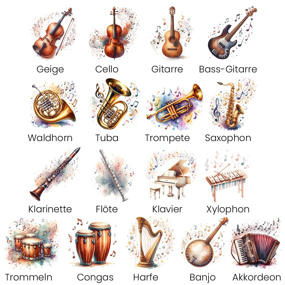 Die Kosmetiktasche besticht durch ein hochwertiges Aquarell-Muster von Musikinstrumenten. Sie haben die Wahl zwischen 17 verschiedenen Designs. Zudem besteht die Möglichkeit, den Namen des Empfängers hinzuzufügen, wodurch die Tasche eine persönliche Note erhält und zu einem Unikat wird.