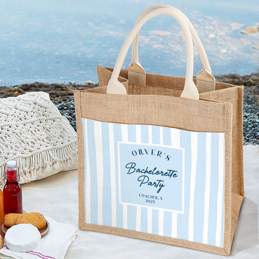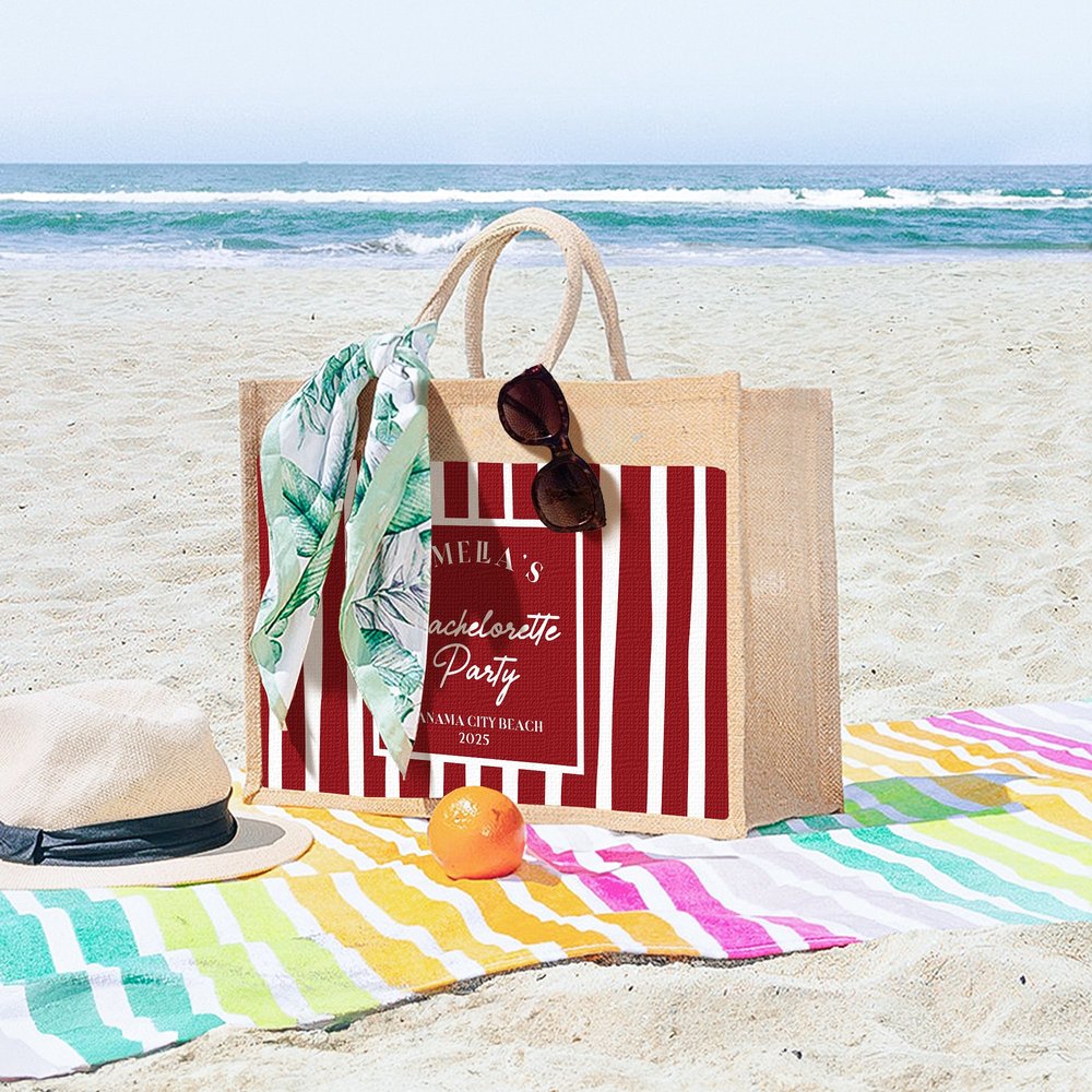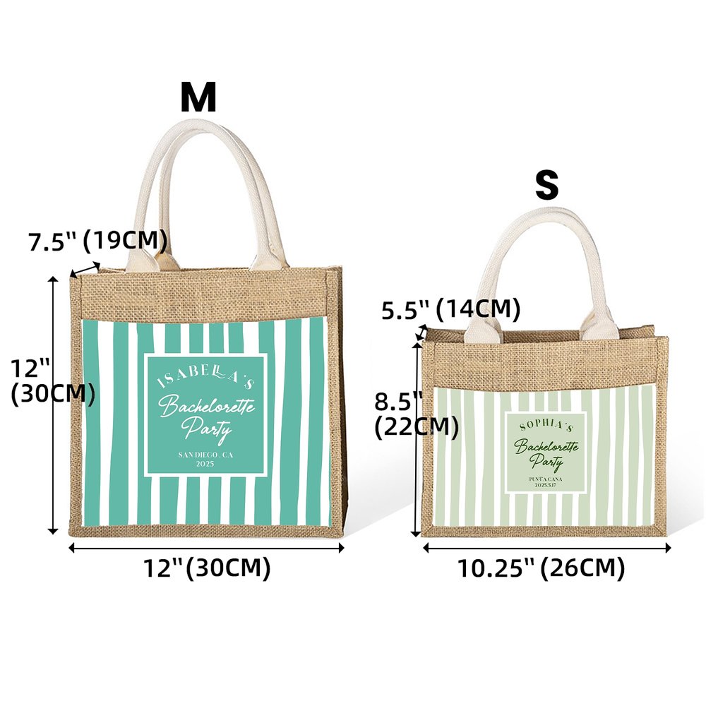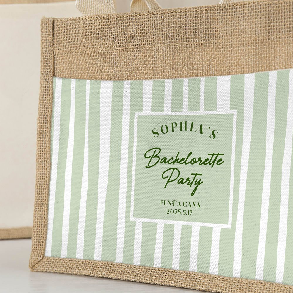 Diese Jutetasche kann mit einem Namen und der Zeit und dem Ort des Junggesellinnenabschieds individuell gestaltet werden. Bedruckt mit einem farbenfrohen und stilvollen Streifenmuster, ist die Tasche voll von Resort-Stil, so dass es ideal für einen Mädelsausflug, Strandurlaub, oder einen kurzen Wochenendausflug.