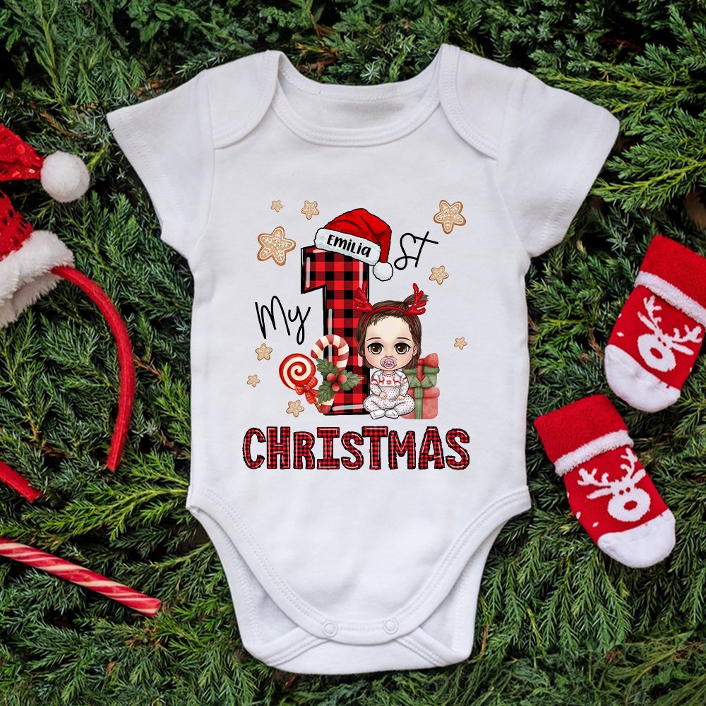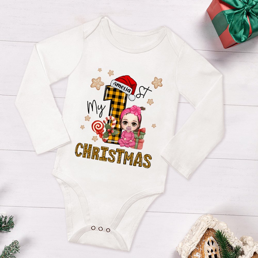 Dieser bezaubernde Body mit niedlichen Cartoon-Figuren, die mit einem weihnachtlichen Design und dem Spruch "My 1st Christmas" verziert sind, ist die perfekte Wahl für festliche Anlässe und Urlaubsfotos. Sie können den Namen des Babys anpassen, um den Weihnachtsgeist zu feiern.