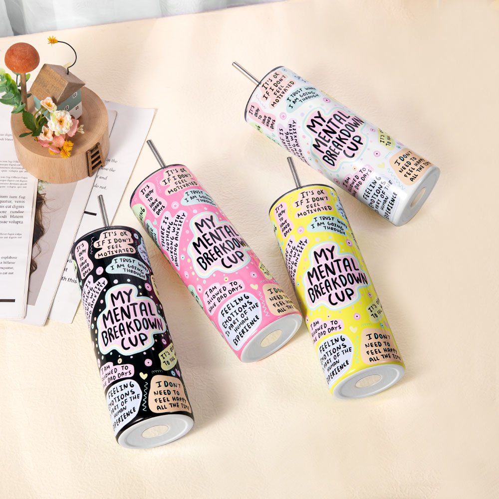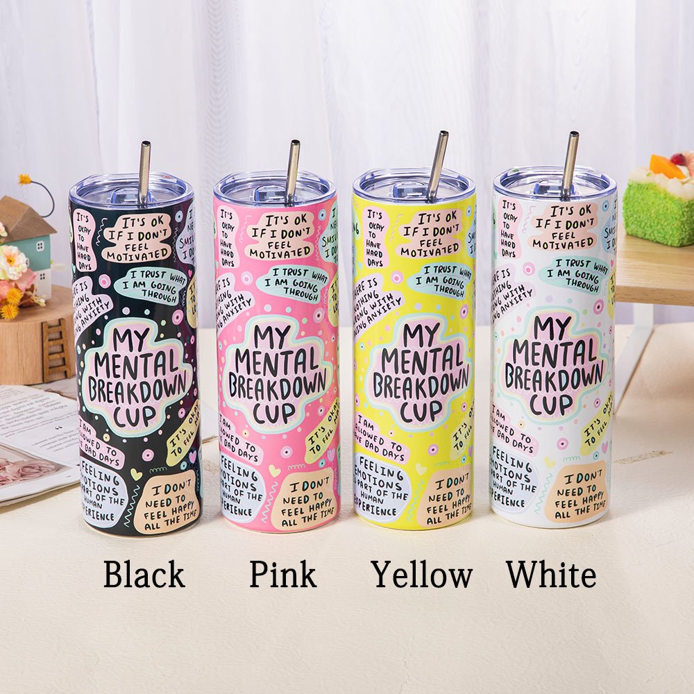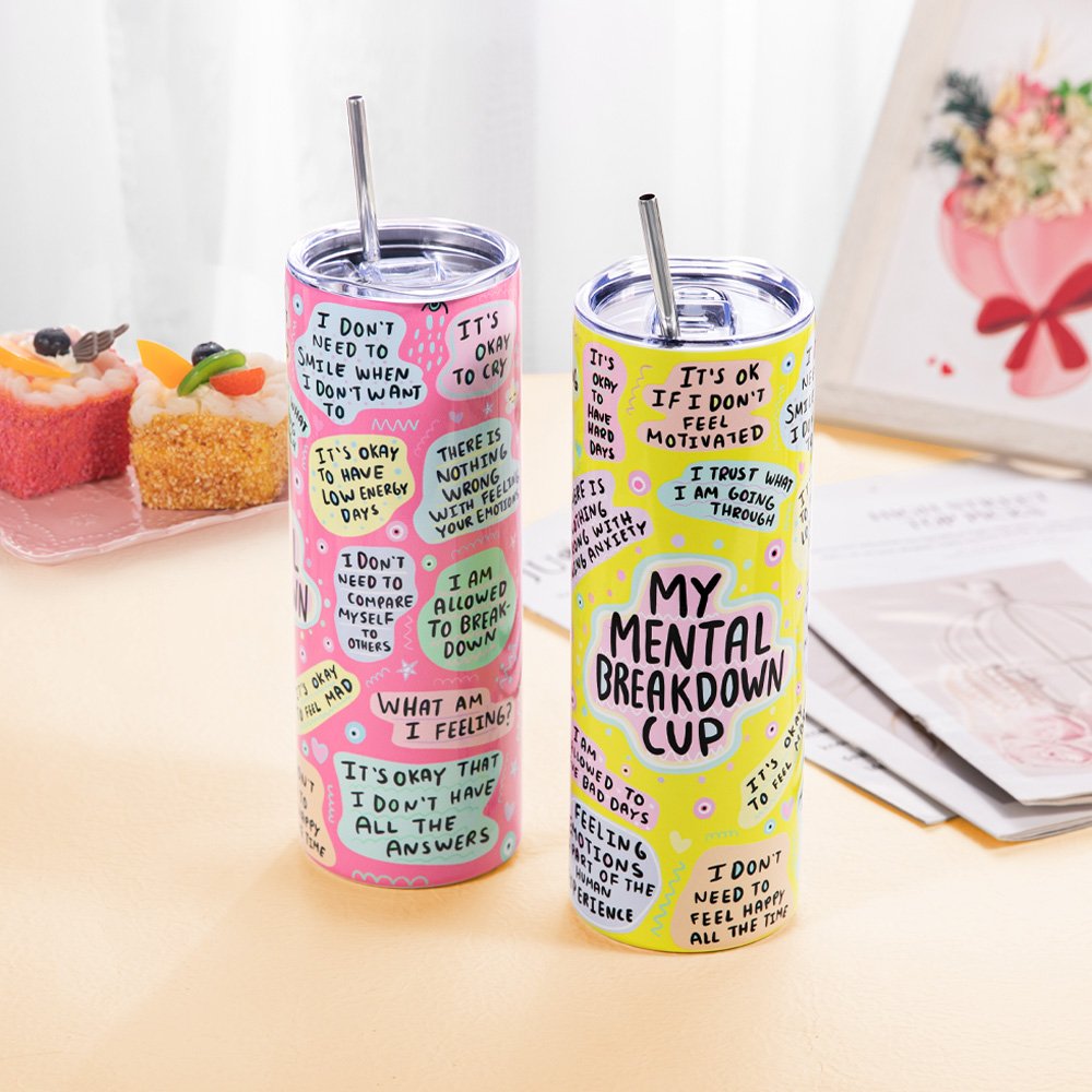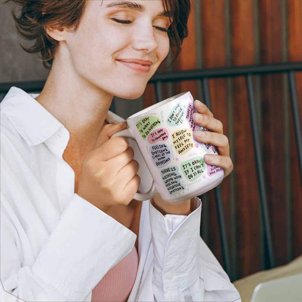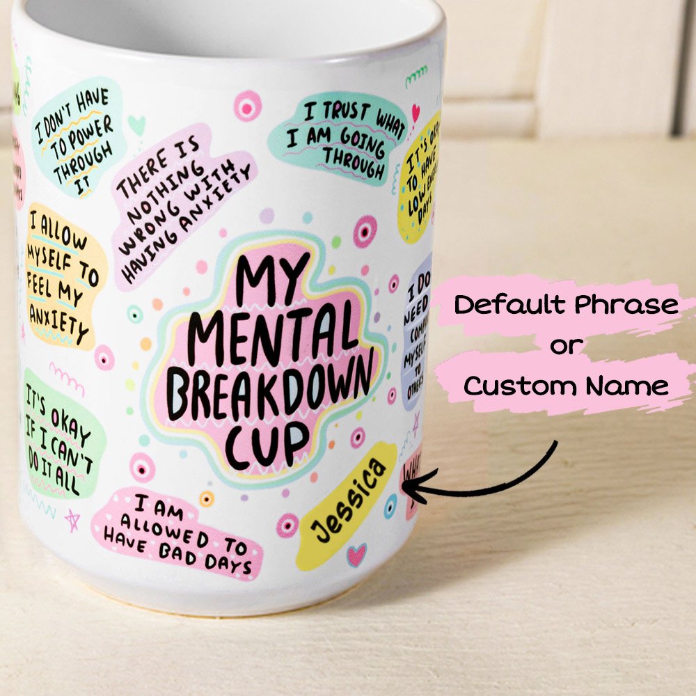 Unsere Tassen sind mit kreativen Designmustern, leuchtenden Farben, warmen täglichen Affirmationen und verschiedenen heilenden grafischen Elementen versehen, die Ihrer Seele Trost und Ermutigung spenden sollen. Der Schriftzug "My Mental Breakdown Cup" ist ein echter Hingucker, und personalisierte Sätze oder Namen machen ihn zu einem einzigartigen Accessoire für Ihre mentale Gesundheit.