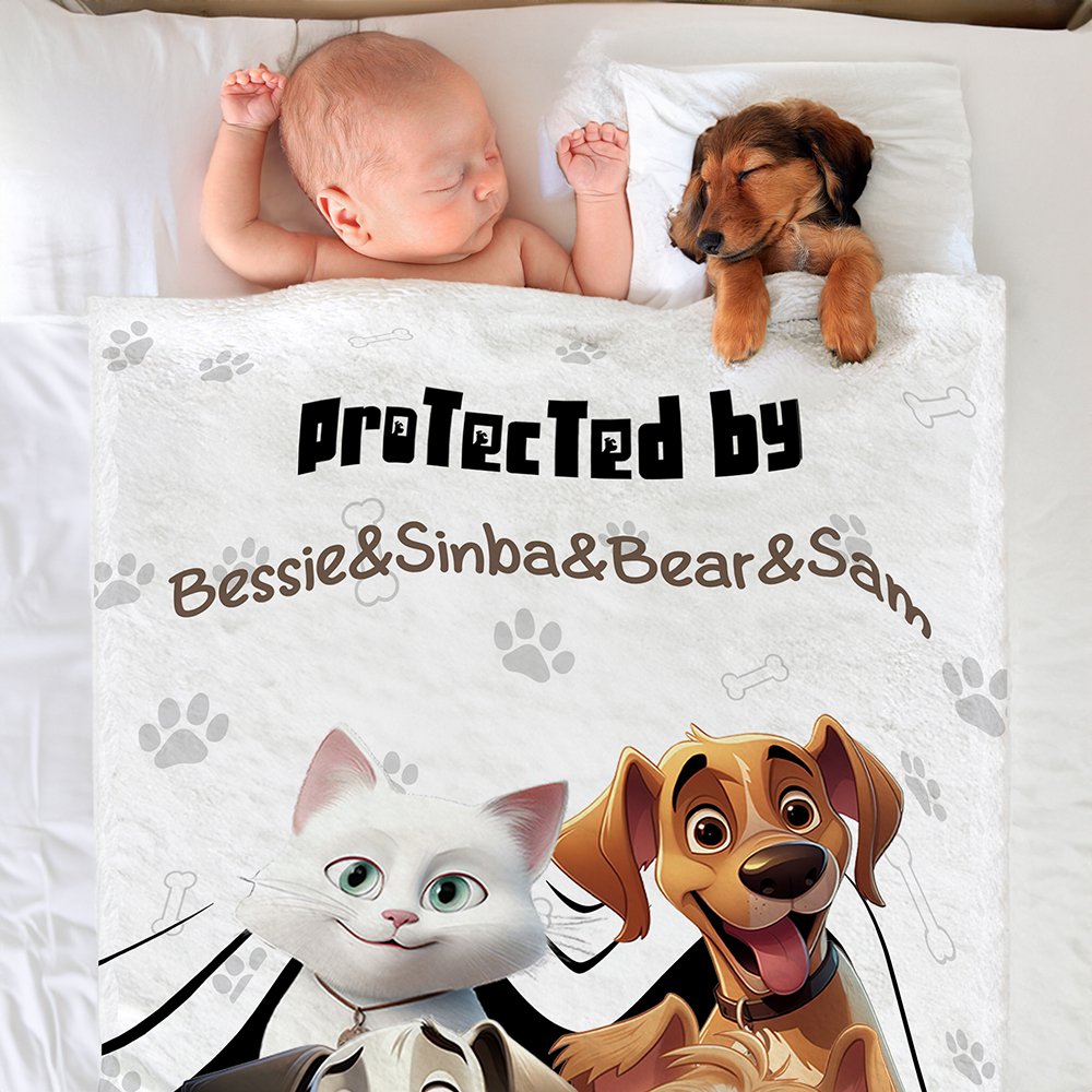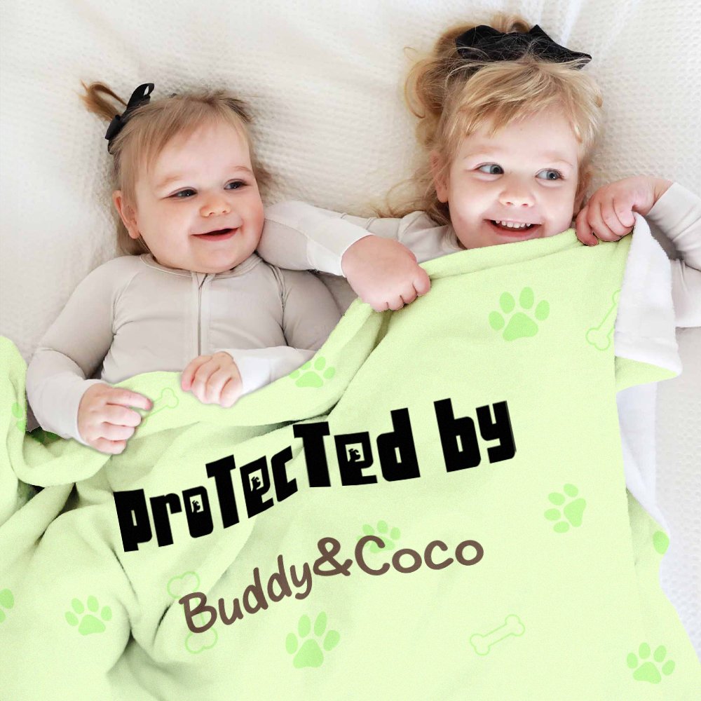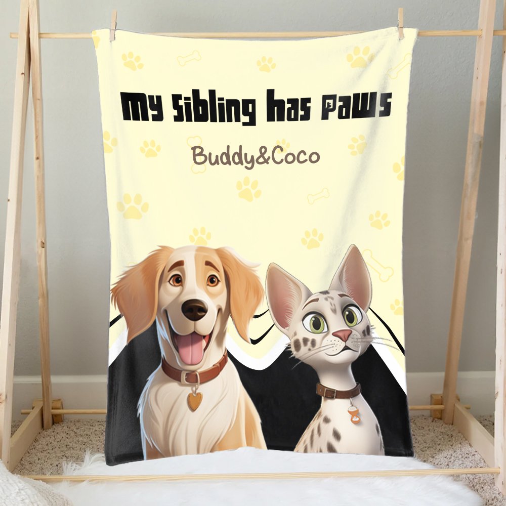 Unsere Decke zeigt ein bezauberndes Cartoon-Tiermotiv mit niedlichen Pfoten und Knochen, das liebenswerte Katzen und Hunde in einem verspielten und künstlerischen Stil hervorhebt. Der auffällige Titel "My Sibling Has Paws" (Mein Geschwisterchen hat Pfoten) verdeutlicht die tiefe Verbindung zwischen Babys und ihren tierischen Begleitern. Es kann auch mit den Namen Ihrer Haustiere und Babys versehen werden, was eine einzigartige und herzliche Atmosphäre in Ihrem Zuhause schafft.