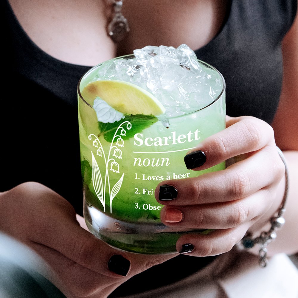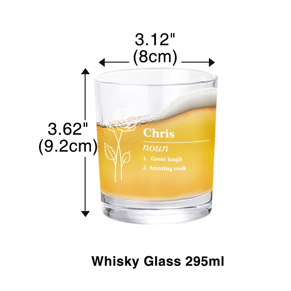 Dieser Whiskey ist mit einer schönen Geburt Blume entworfen, können Sie es mit Ihrem Namen sowie Name-definierenden Text anpassen. Der Name Definition Design ist sehr interessant, und die Anpassung macht diese Whiskey-Glas sinnvoll.