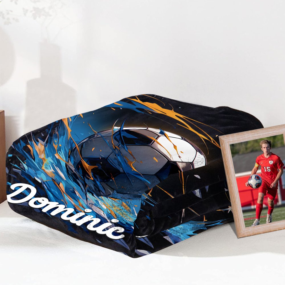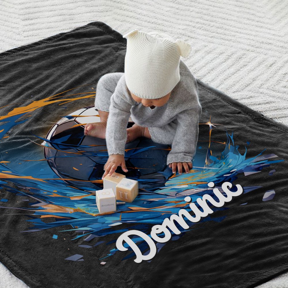Diese Fußballdecke zeigt ein realistisches Fußballmuster, umgeben von dynamischen blauen und orangefarbenen Linien, die die Bewegung eines Fußballs im Spiel simulieren und das Gefühl von Energie verstärken. Die eine Seite ist bedruckt, die andere Seite ist rein weiß. Sie können sie auch mit dem Namen Ihres Kindes bedrucken lassen und so ein einzigartiges Stück für Ihr Zuhause schaffen.