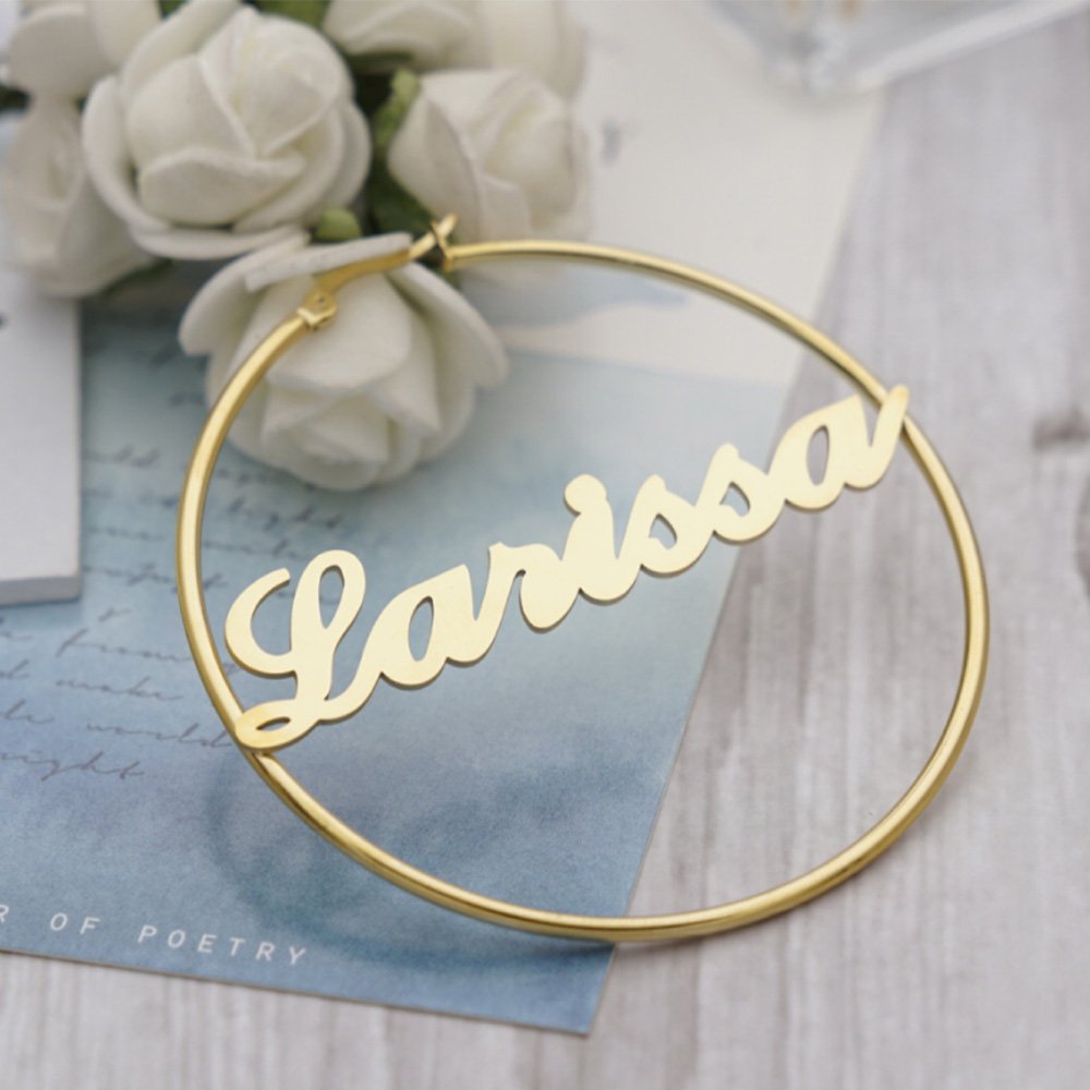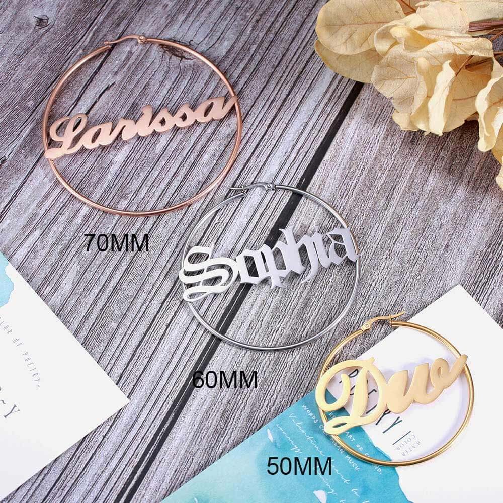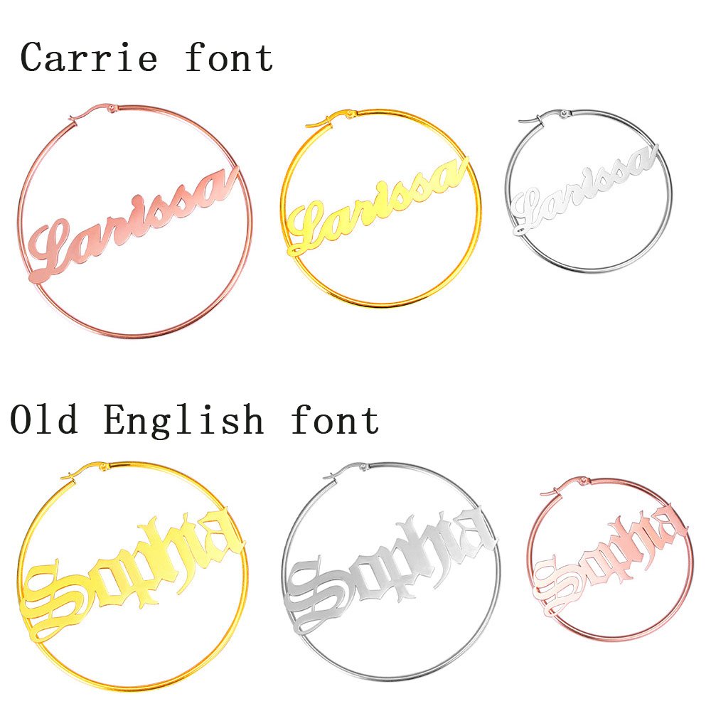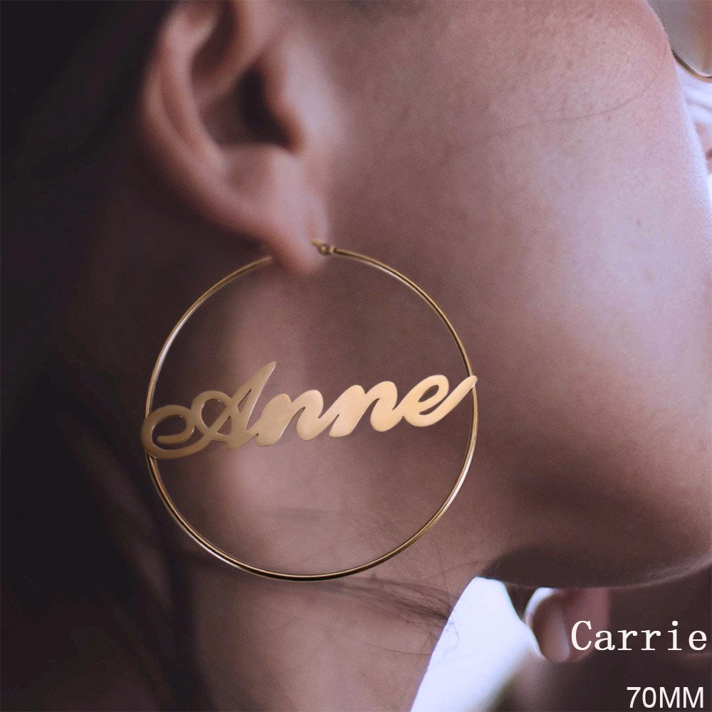 • Diese von Callie angebotenen Ohrringe sind große Creolen mit benutzerdefinierten Namen. Verleihen Sie Ihrem Outfit mit diesen klassischen Creolen-Ohrringen einen Hauch von Schönheit und Raffinesse. Personalisieren Sie diese Creolen mit einem beliebigen Namen oder inspirierenden Wörtern, um ein bedeutungsvolles Accessoire zu kreieren. Einfach und modisch, einzigartig und verspielt, kreieren diese Ohrringe einen Hip-Hop-Stil und heben die klassischen Buchstaben und Creolen hervor. Erhältlich für drei Größen und sechs Schriftarten zur Auswahl.