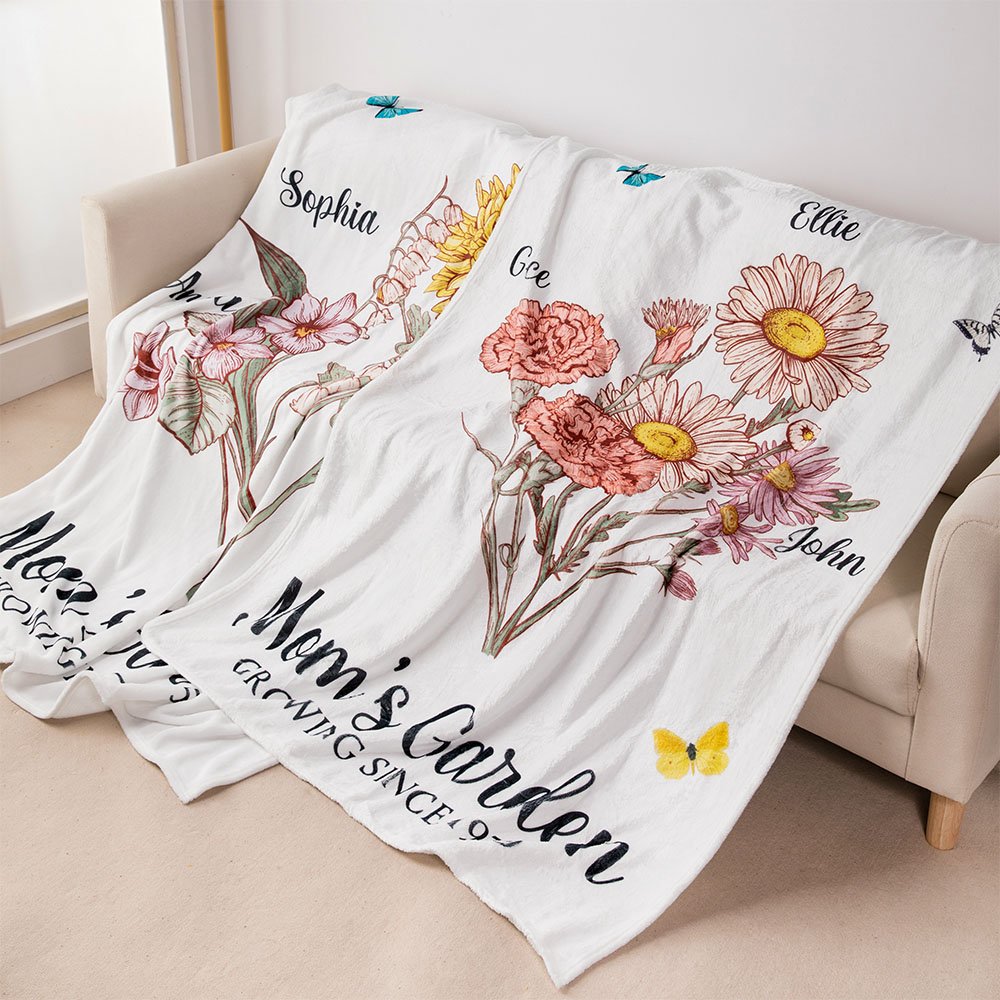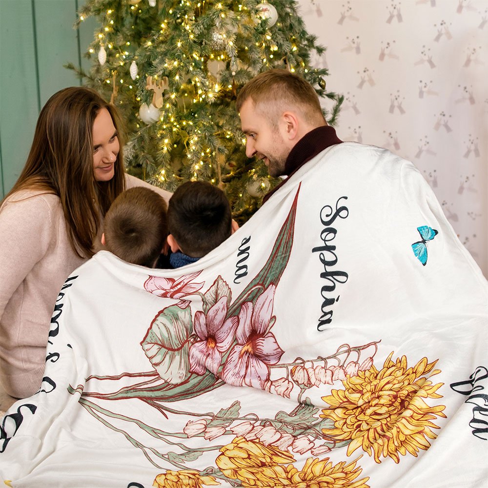 Each person's birth month has its unique birthday flower, each with its special meaning. Our blanket is inspired by this, the family is like a big garden, the beautiful birth flowers represent every member of the family, and tying the flowers into a bouquet symbolizes that the whole family is always together, united in love. The butterflies surrounding it also signify the beauty of this sentiment.