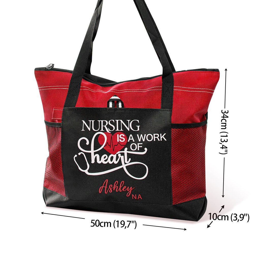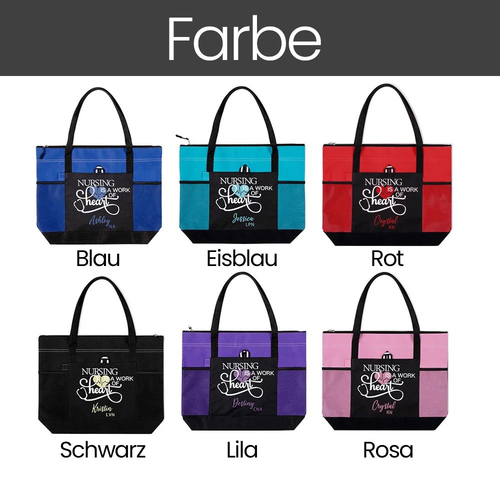 Die kühne Aussage "Nursing is a Work of Heart", die auf der Tragetasche prangt, ist mehr als nur Worte; sie ist eine Erklärung der Leidenschaft und des Mitgefühls, die Krankenschwestern in ihren Beruf einfließen lassen. Das Design verdeutlicht die Selbstlosigkeit und Hingabe, die diese Helden des Gesundheitswesens auszeichnen.