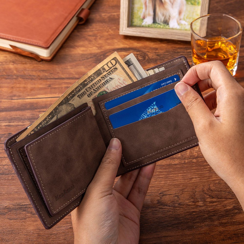 Diese Geldbörse ist aus hochwertigem PU-Leder gefertigt und daher wasserdicht und langlebig. Darüber hinaus ist sie leicht zu reinigen und zu pflegen. Das kompakte Design macht sie perfekt für den Transport, und sie passt leicht in einen Kleidersack, eine Aktentasche oder einen Koffer.
