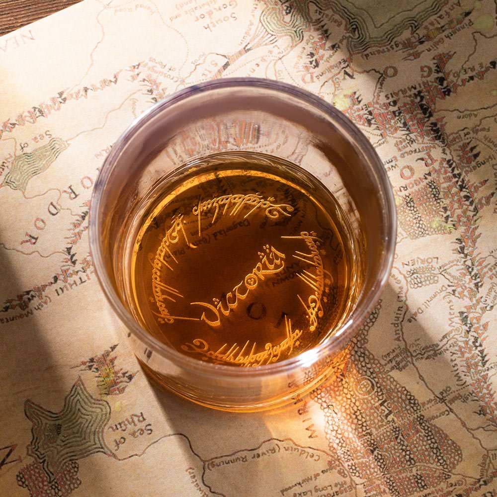Erleben Sie mit unserem individuell gestalteten Whiskeyglas die faszinierende Welt des Rings. Das Design, inspiriert vom Einen Ring, besticht durch eine schwarze Gravur am Glasboden und verleiht Ihrem Trinkerlebnis eine geheimnisvolle und stilvolle Atmosphäre. Genießen Sie mit jedem Schluck die besondere Magie von Mittelerde ganz unmittelbar.