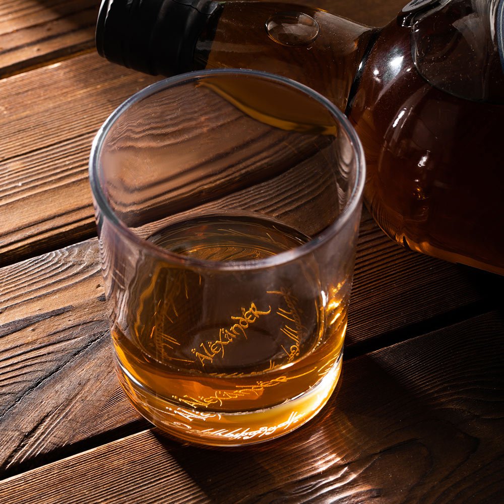 Gestalten Sie dieses Whiskeyglas ganz individuell, indem Sie es mit einem Namen versehen lassen. Das personalisierte Design macht das Glas zu einem besonderen und liebevoll gestalteten Geschenk. Bei jedem Genuss wird der Beschenkte den eingravierten Namen am Glasboden entdecken und sich daran erfreuen.
