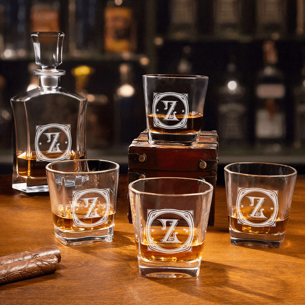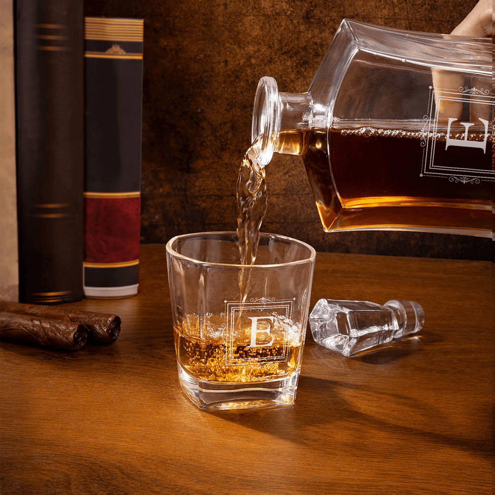 Diese Whiskey-Karaffe mit klassischem Monogramm und raffiniertem Design bietet einen zeitlosen Look, der jeden Barwagen oder jedes Regal aufwertet. Mit der optionalen Lasergravur können Sie Ihre Initialen für eine persönliche Note hinzufügen.