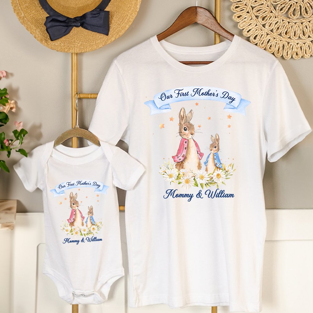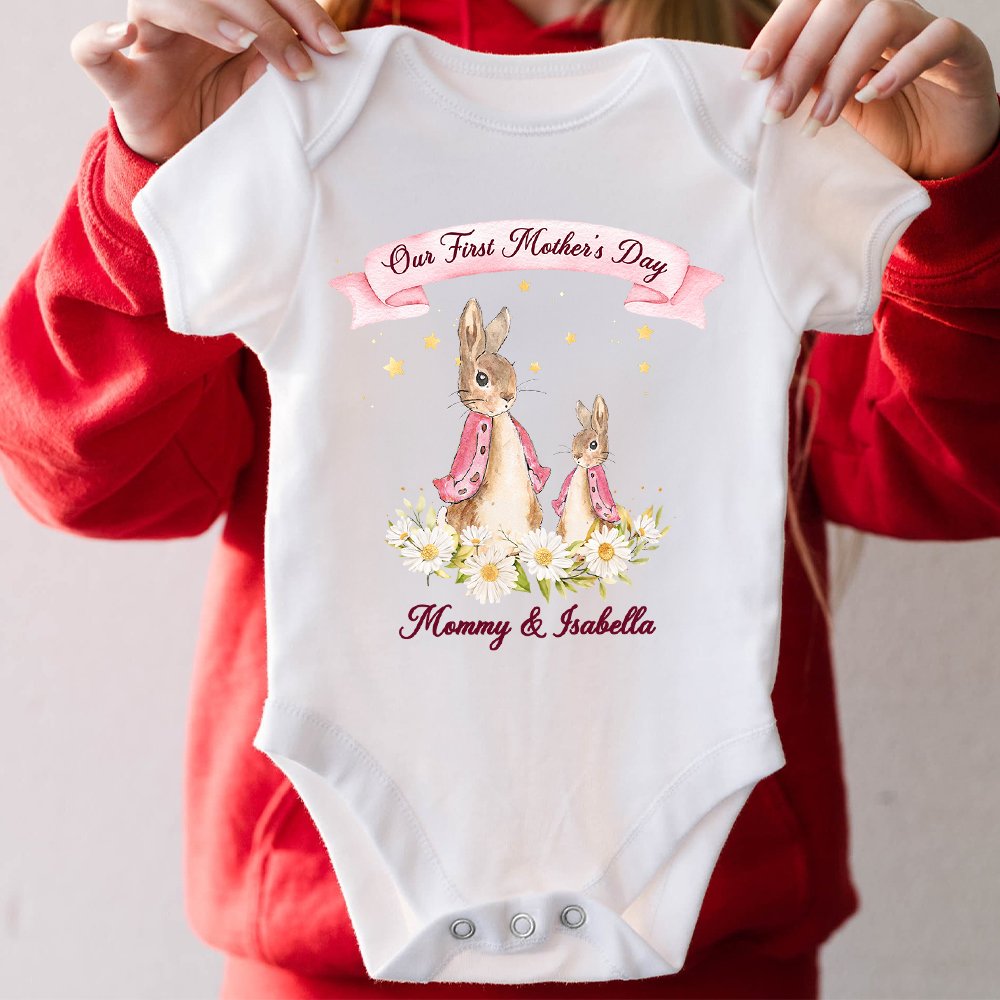 Personalisierte Unsere erste Muttertag Peter Rabbit Bunny Floral Baby Onesie mit Namen Muttertag Baby Dusche Geschenk für neugeborenes Baby