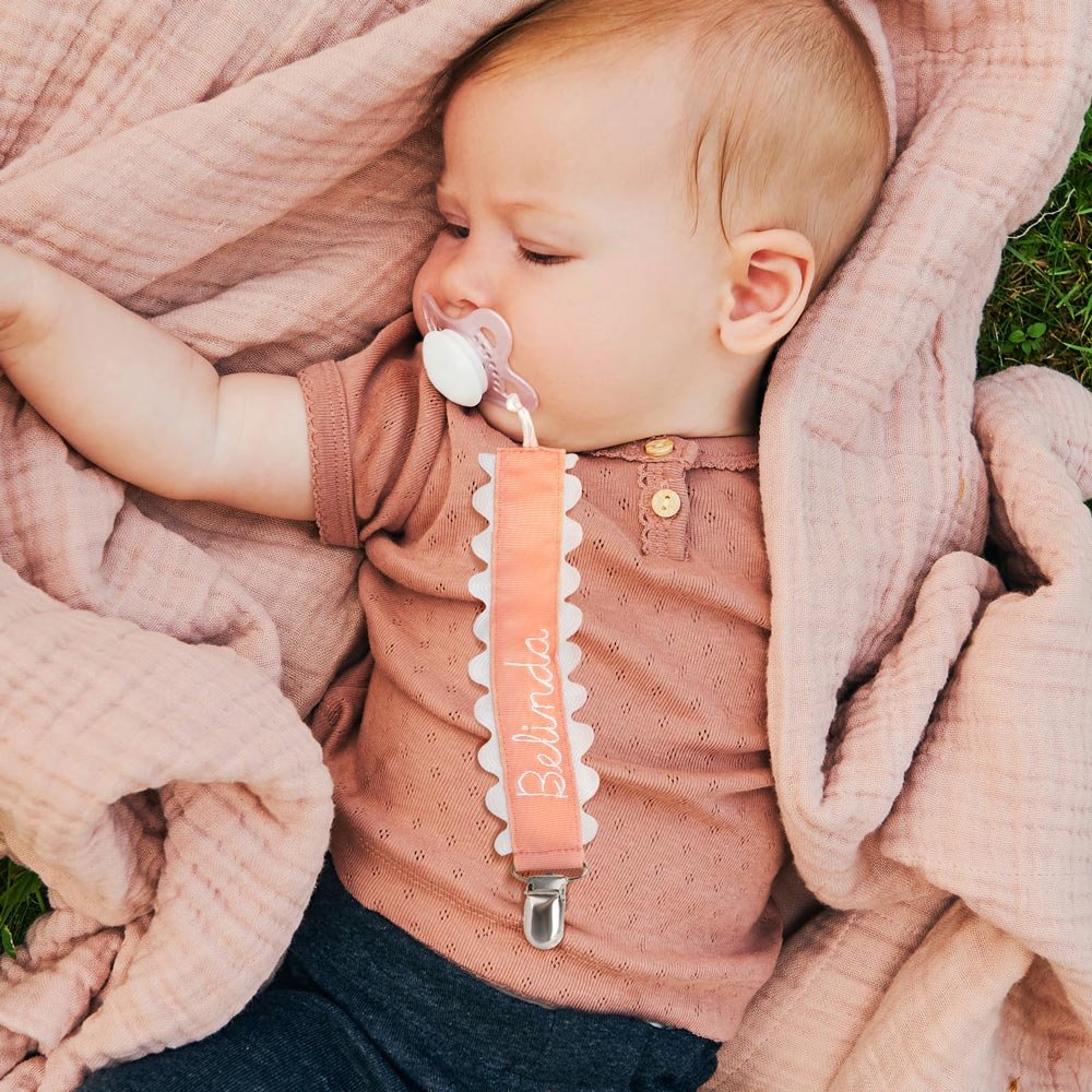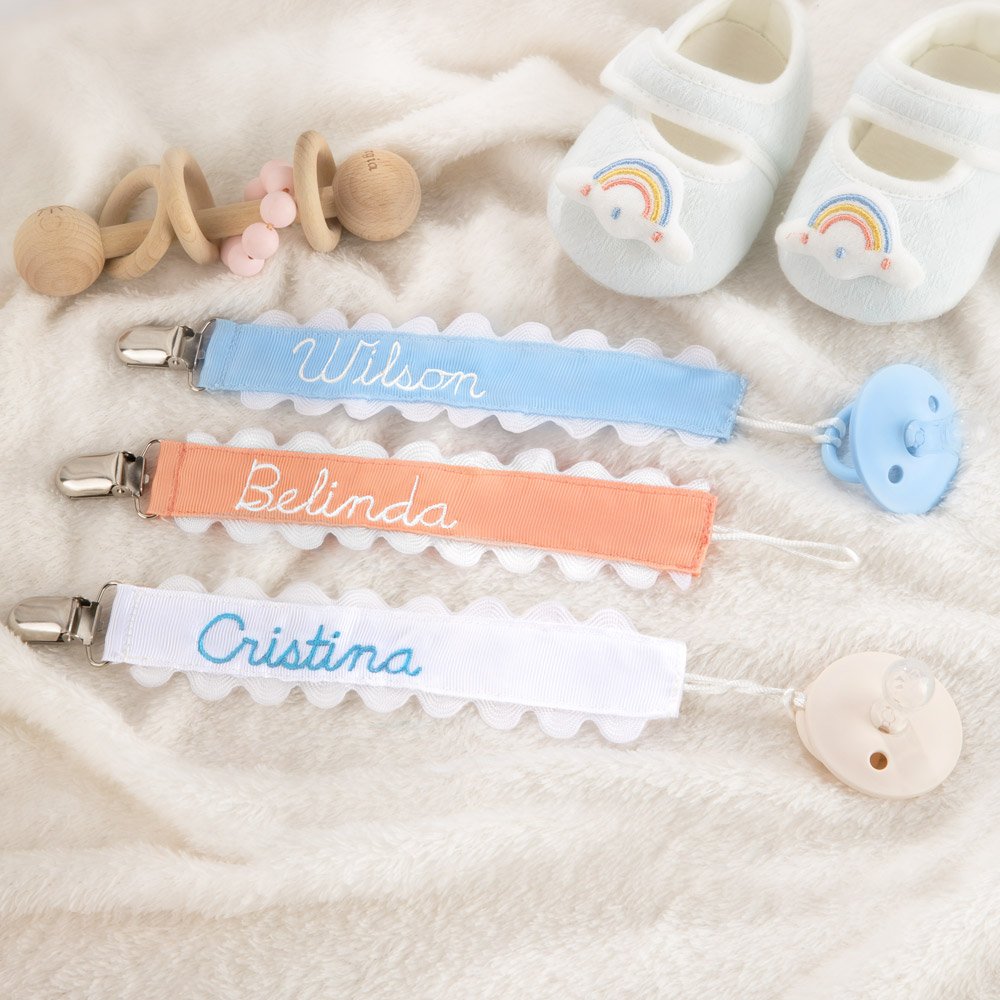 Das Stickereiband auf diesem Schnullerhalter verleiht ihm einen Hauch von Eleganz und Personalisierung. Sie können aus einer Vielzahl von Farben wählen, um ihn mit dem Namen oder den Initialen Ihres Babys zu personalisieren. Das macht es nicht nur einfacher, den Schnuller Ihres Babys zu identifizieren, sondern verleiht ihm auch einen stilvollen und trendigen Look.