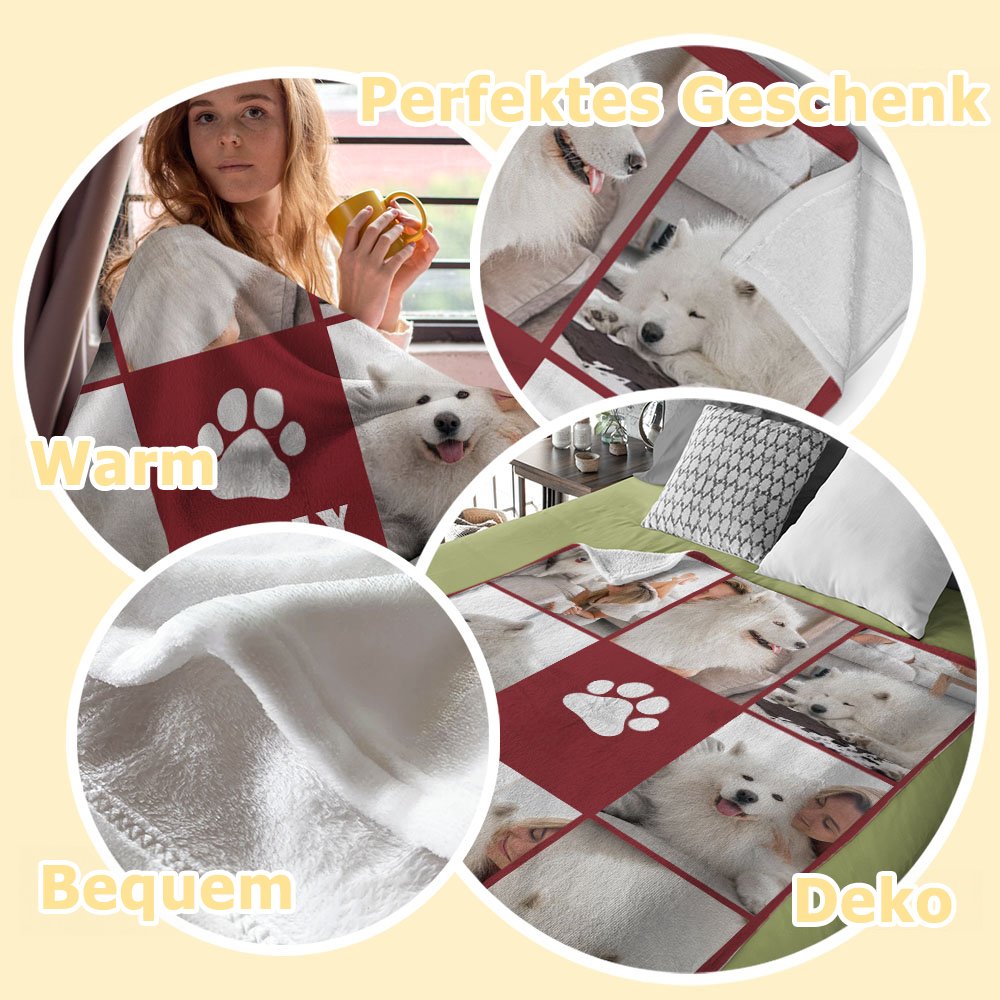 Diese personalisierte Fotodecke wurde speziell für echte Tierliebhaber entworfen. Sie können bis zu acht Lieblingsfotos sowie den Namen Ihres Haustiers gestalten. Zudem stehen Ihnen rund 30 Hintergrundfarben zur Auswahl – so bleibt die Nähe zu Ihrem vierbeinigen Freund immer etwas, das Ihr Herz wärmt.