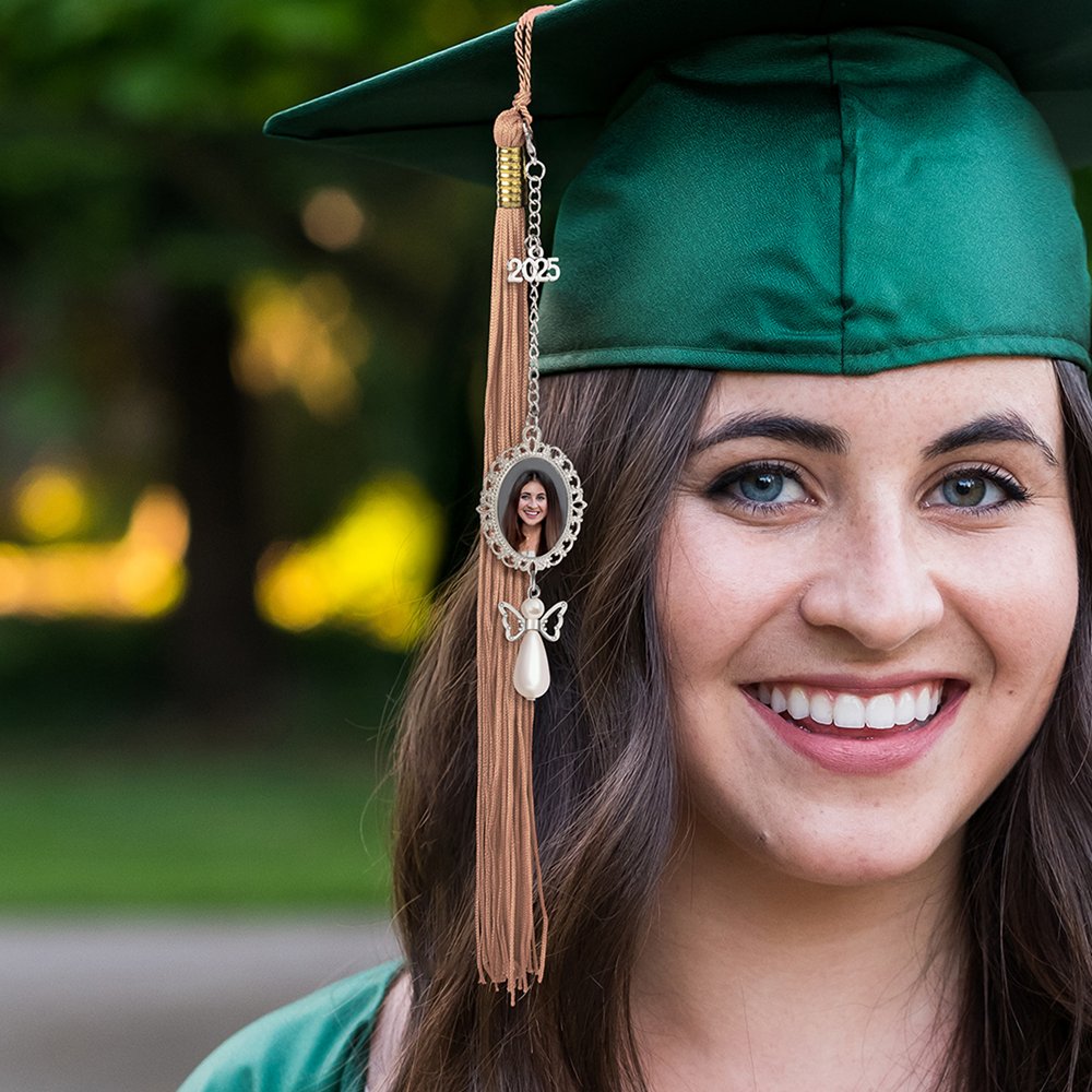 Der Fotoanhänger für die Abschlussklasse 2025 ist ein wunderschöner ovaler Anhänger, der wertvolle Erinnerungen festhält. Mit diesem einzigartigen Anhänger können Absolventen ein Foto ihrer Liebsten, wie z. B. ihrer Eltern, Klassenkameraden oder Großeltern, an ihrer Abschlussmütze befestigen. Der Anhänger ist mit einer Perle und einem Schmetterling verziert, was ihm ein schönes und stilvolles Aussehen verleiht. Er verleiht der Abschlussfeier eine persönliche Note und stellt sicher, dass diese besonderen Menschen an diesem wichtigen Tag dabei sind.