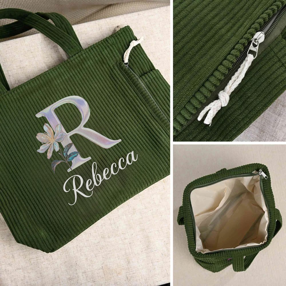 Im Mittelpunkt dieser Tragetasche steht ein Blumenmuster mit Perleneffekt, das durch individuell anpassbare Namen und Initialen ergänzt wird, um Ihre persönliche Note im Design hervorzuheben. Die schlichte Silhouette fügt sich harmonisch in den Retro-Cord-Stoff ein und verleiht Ihrem Alltagspendelweg einen stilvollen und persönlichen Charakter.