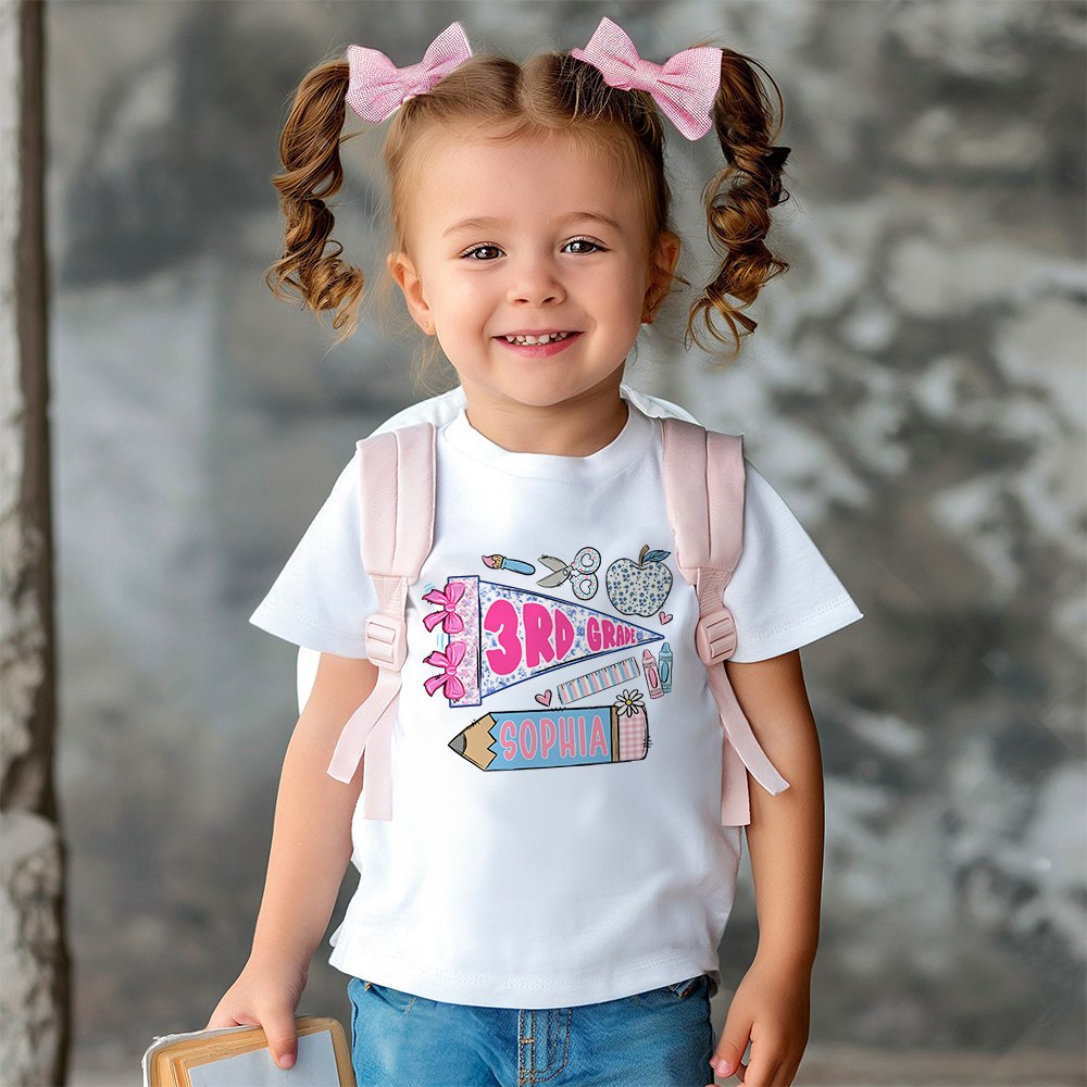 Dieses T-Shirt zeigt Bilder, die mit dem Lernen zu tun haben, wie Bleistifte, Äpfel, Scheren und Buntstifte, die eine flaggenartige Form bilden. Das Gesamtdesign ist verspielt und ansprechend, perfekt für Mädchen im Vorschulalter. Das T-Shirt kann mit dem Namen und der Klassenstufe individuell gestaltet werden und ist somit mehr als nur ein Kleidungsstück; es wird zu einer Plattform für Kinder, um ihre Individualität und Liebe zur Schule auszudrücken.