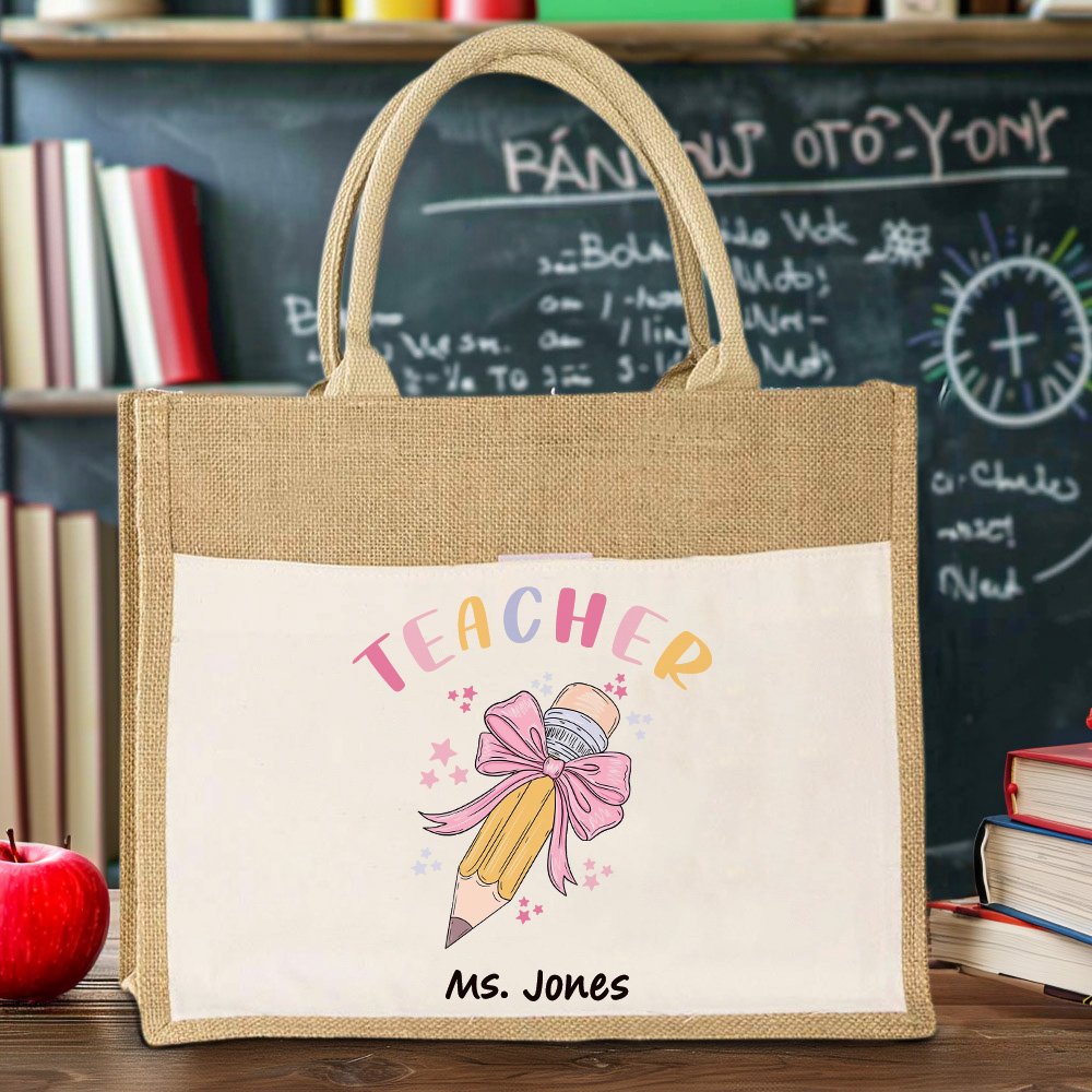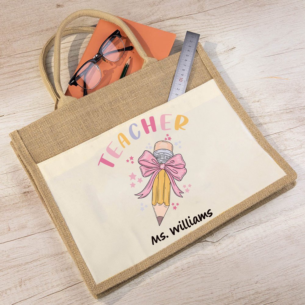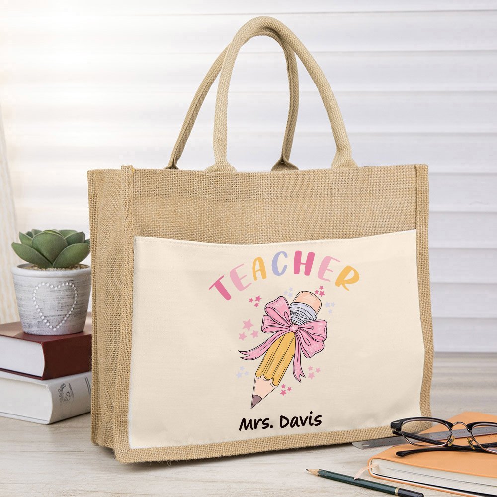 Diese Tasche kombiniert die Elemente eines Bleistifts, einer rosa Schleife und kleiner bunter Sterne, und das Design ist stilvoll, kindlich und voll von Lehrer Eigenschaften. Um die Tasche noch herzlicher zu gestalten, können Sie den Namen der Lehrerin oder des Lehrers einfügen, damit jedes Geschenk von Herzen kommt.